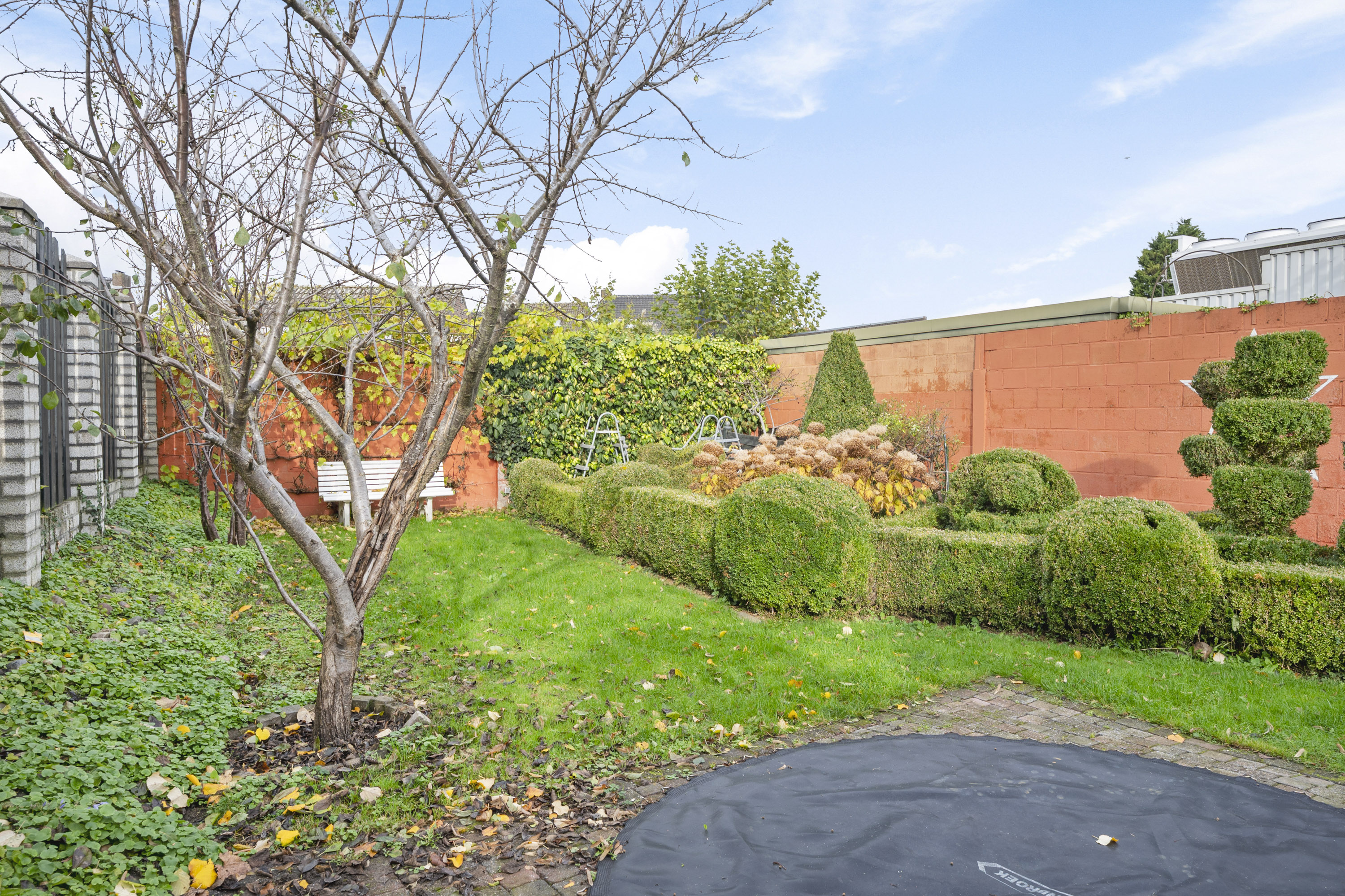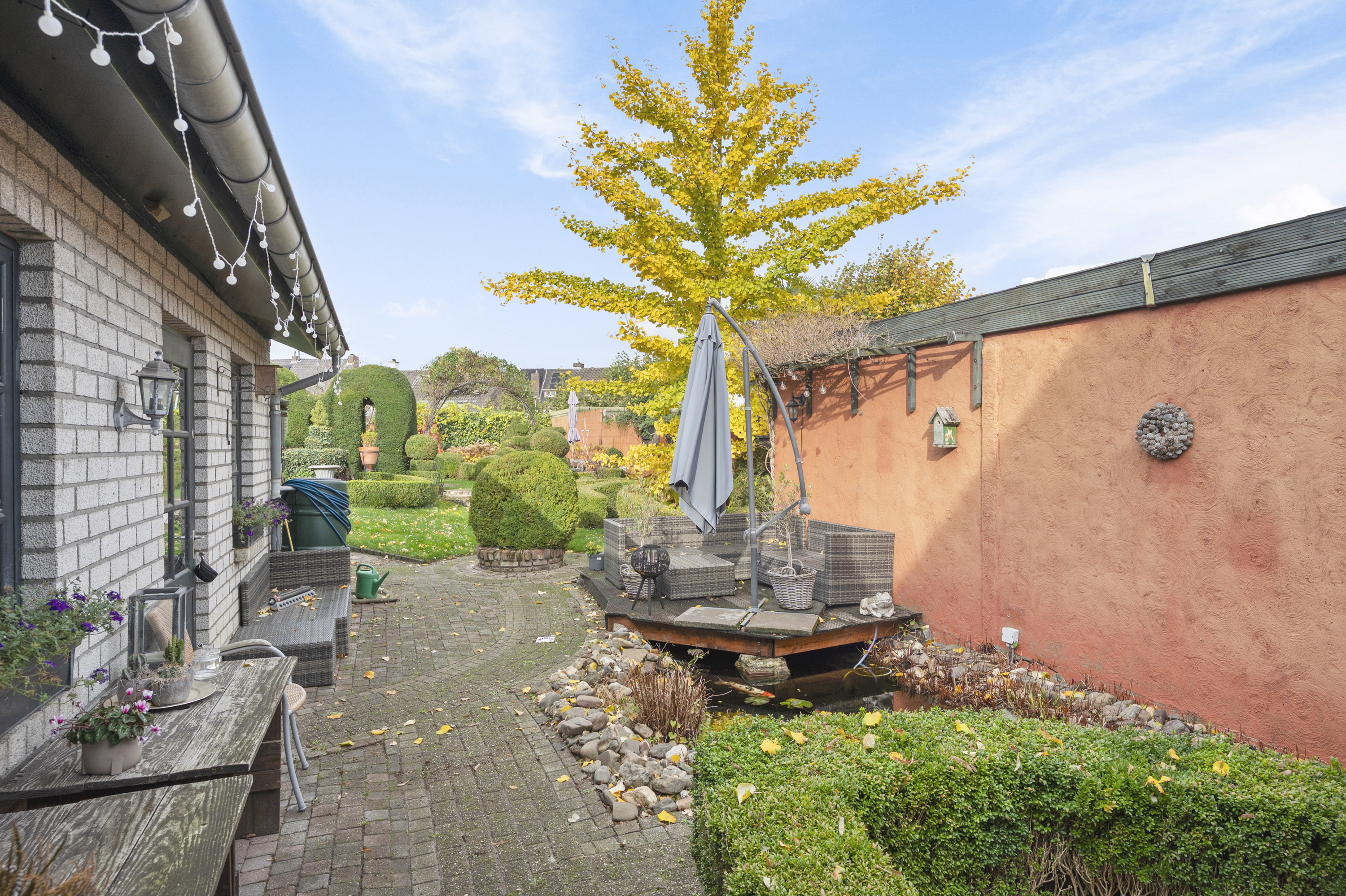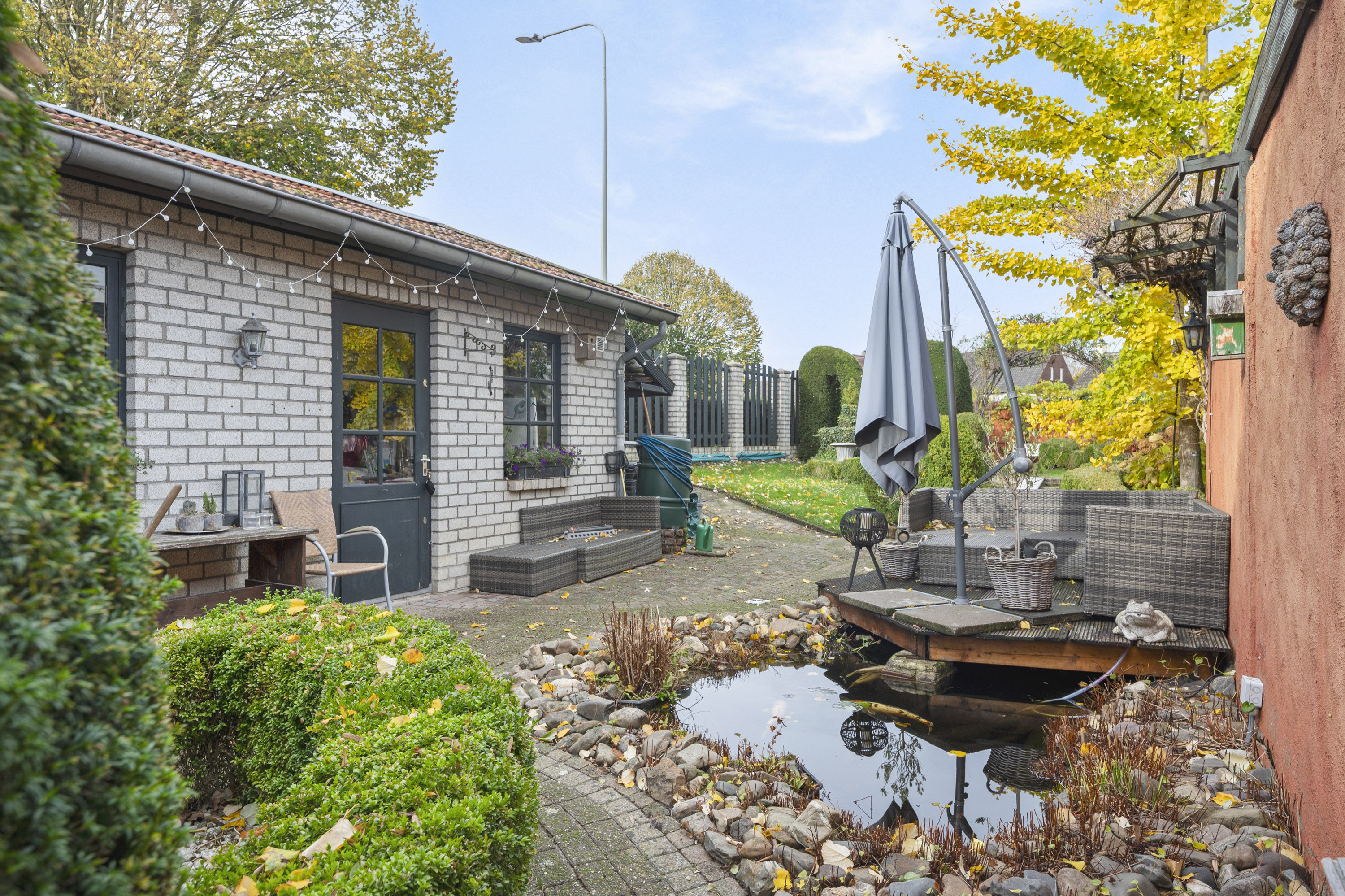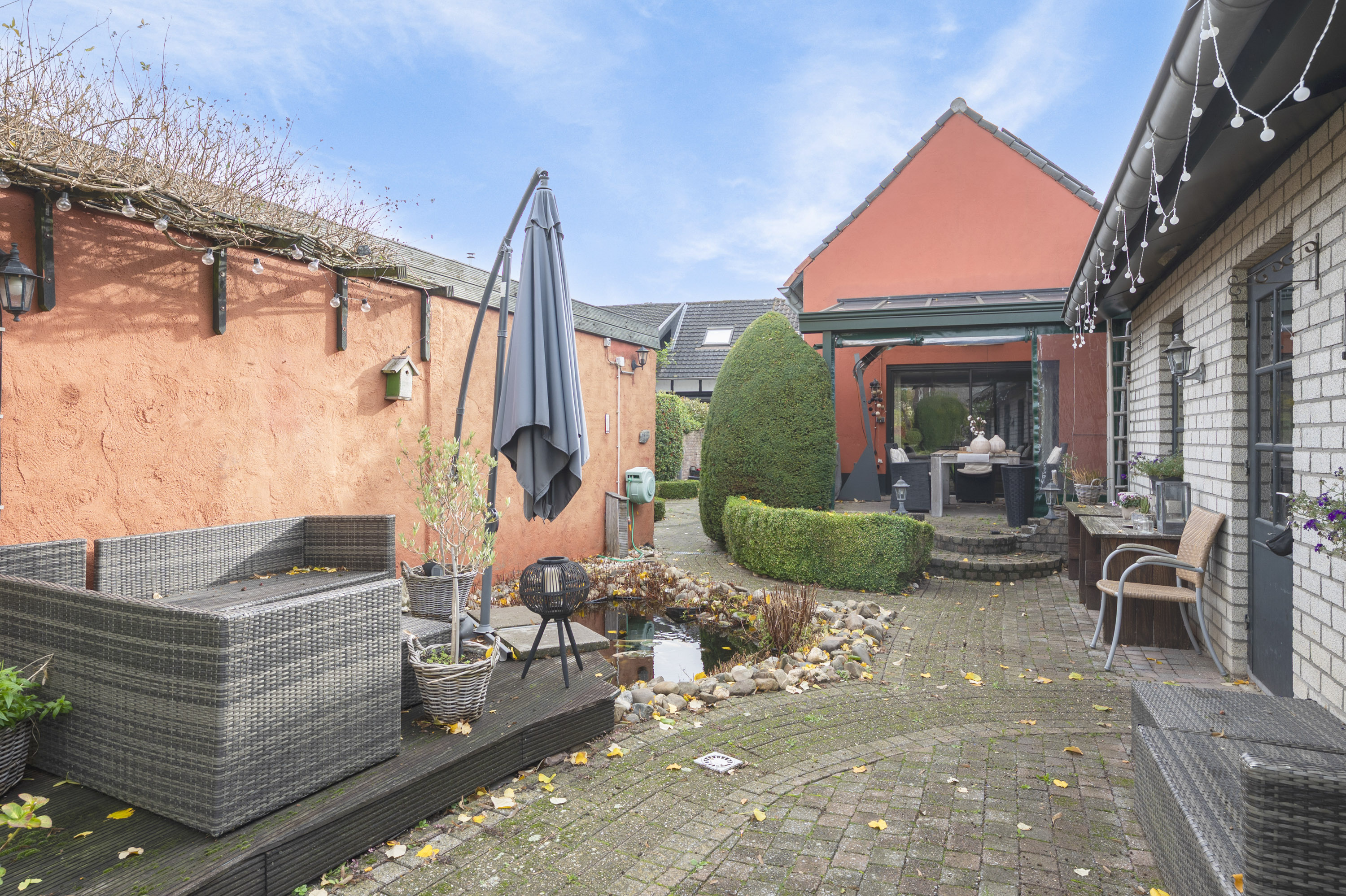 Geniet van de sfeervolle binnenplaats en de royale tuin, uitgerust met borders, vijver, ruime berging (2,20 x 6,30 m) in spouw, overkapping en achteringang naar de openbare weg.