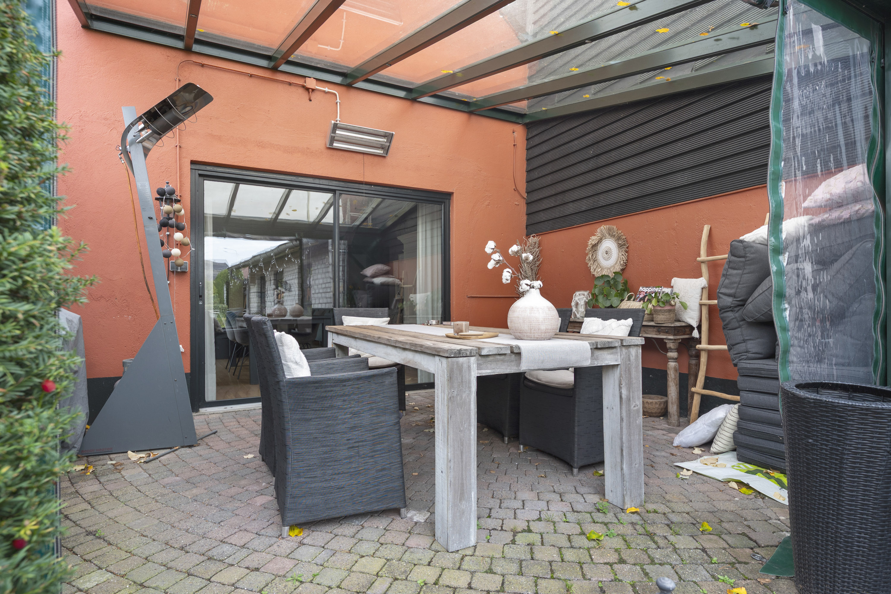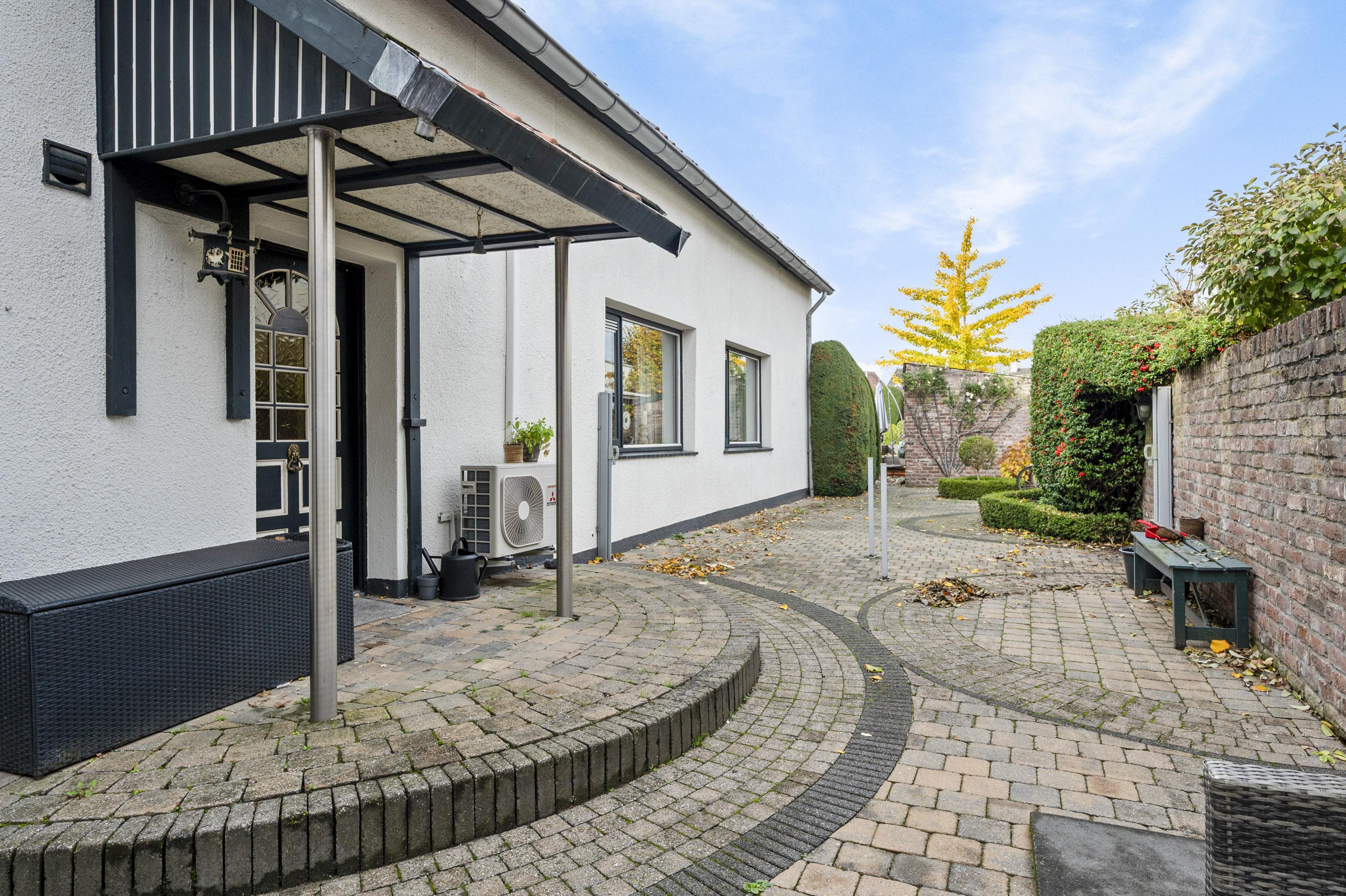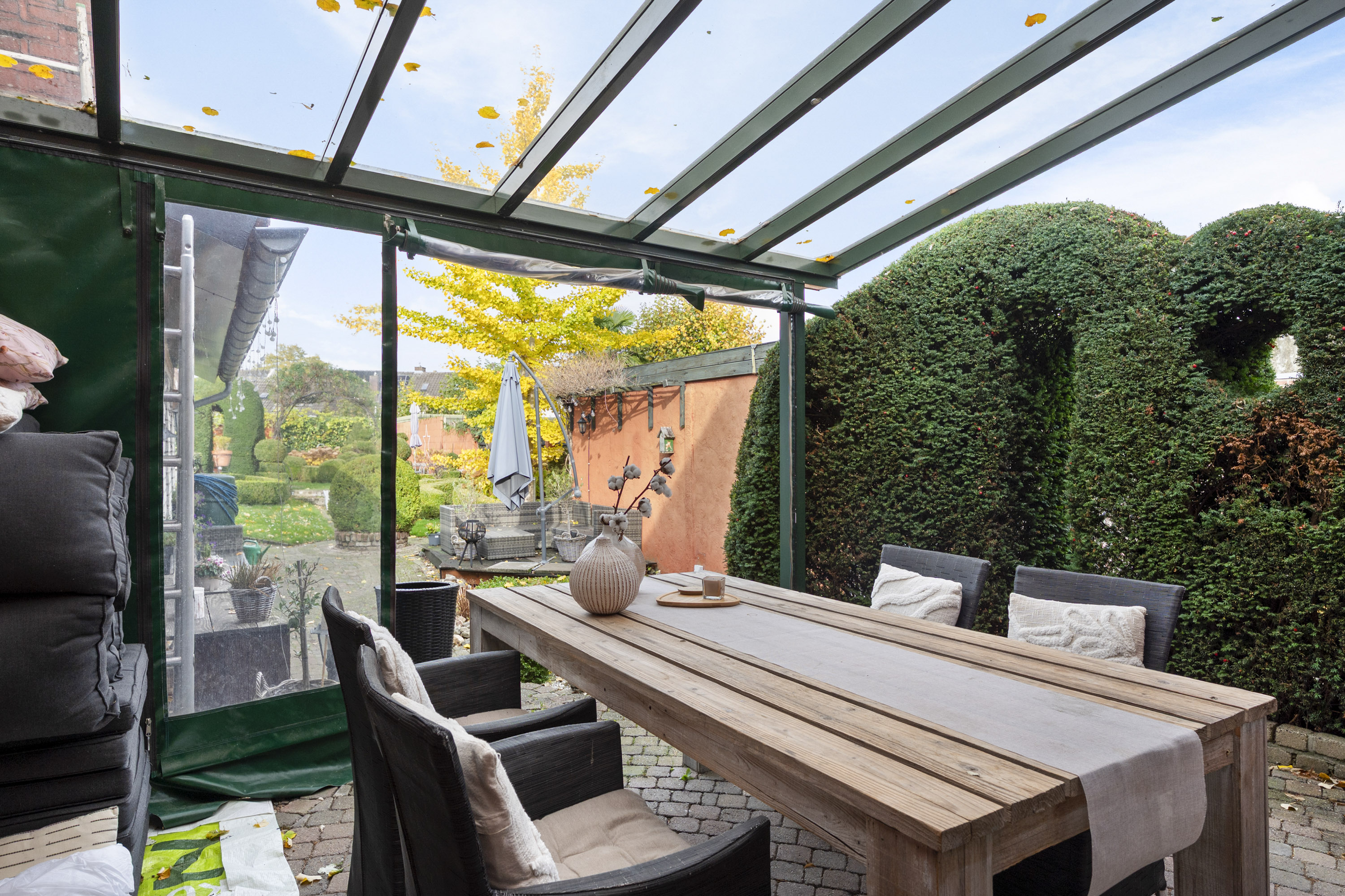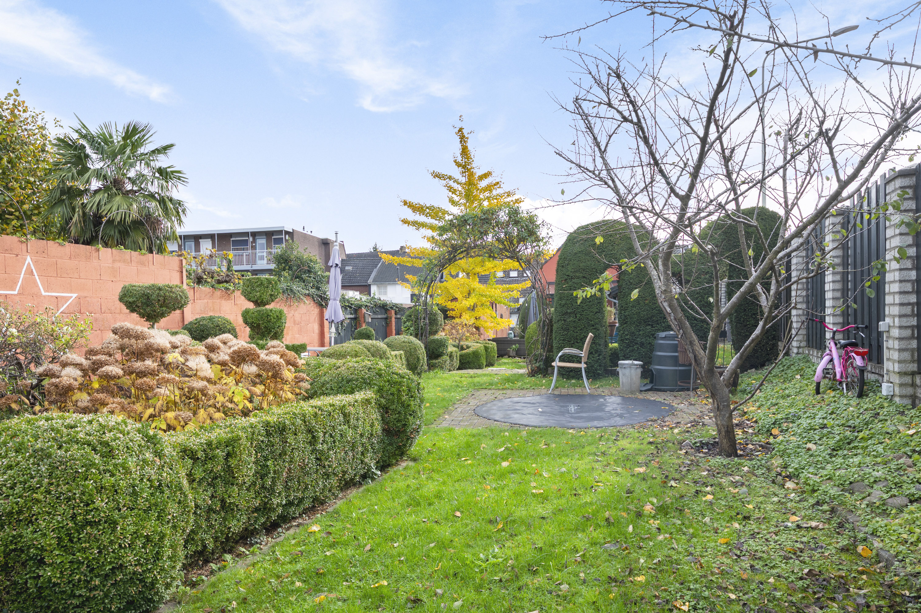 Geniet van de sfeervolle binnenplaats en de royale tuin, uitgerust met borders, vijver, ruime berging (2,20 x 6,30 m) in spouw, overkapping en achteringang naar de openbare weg.
