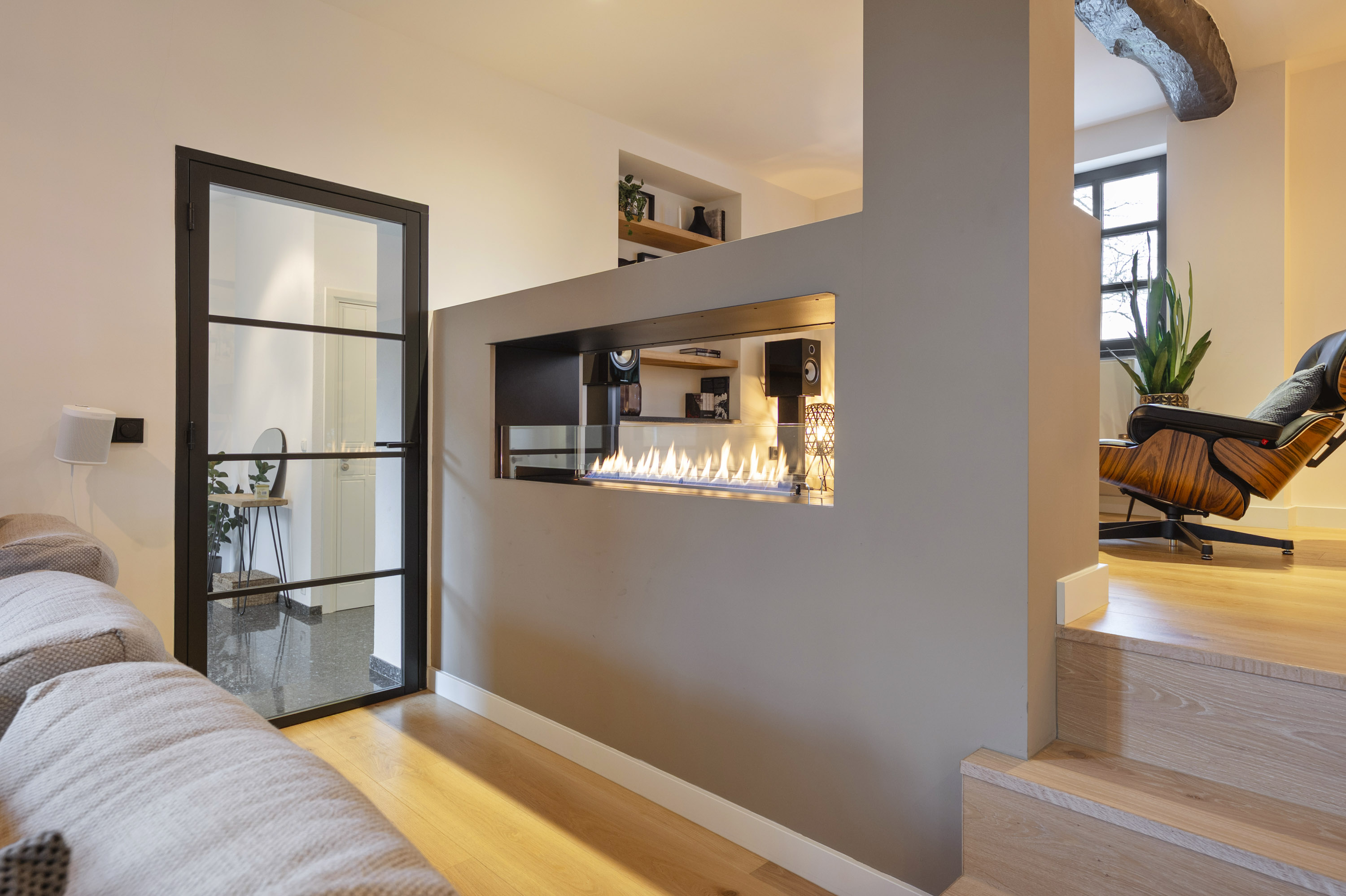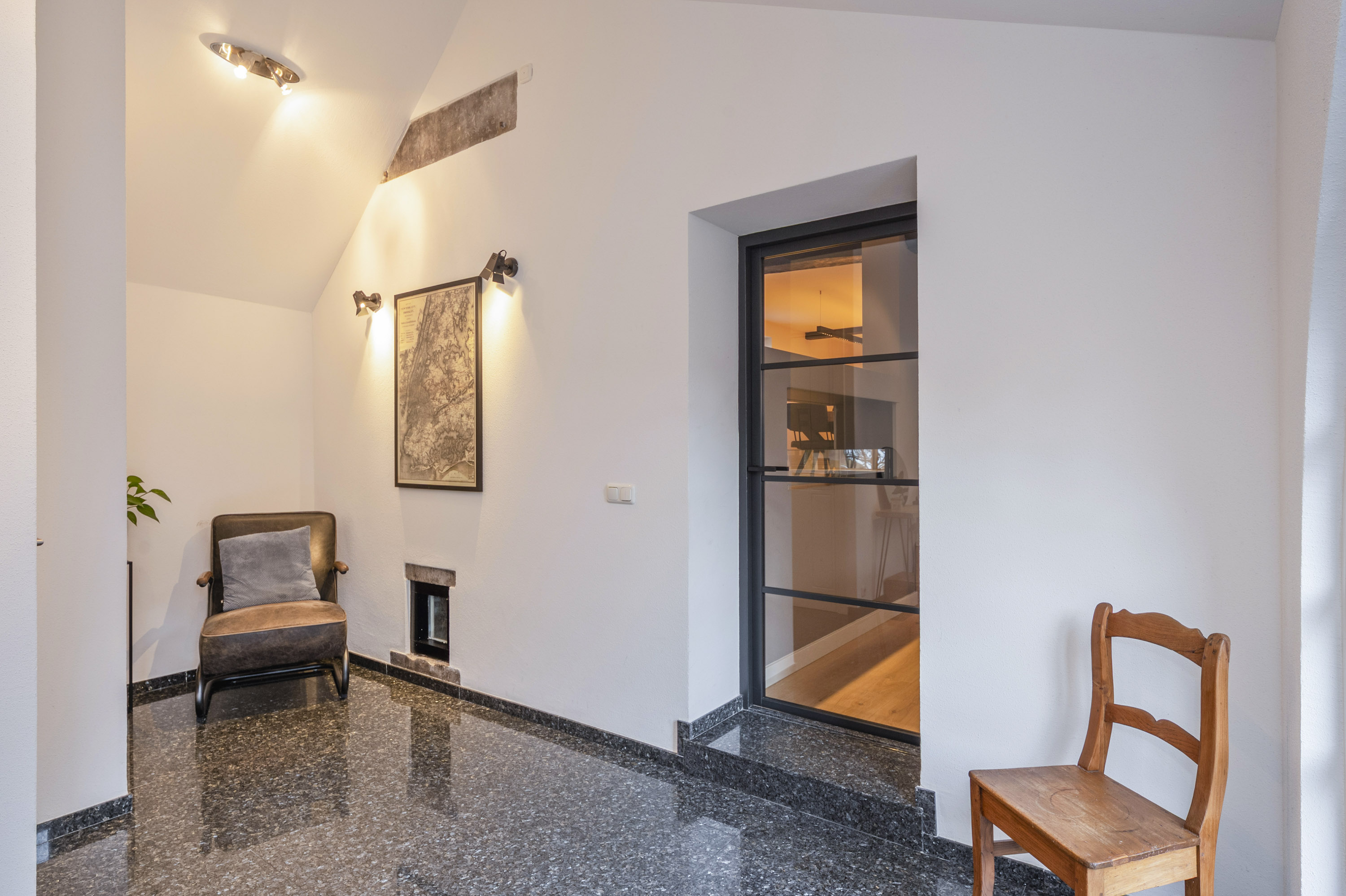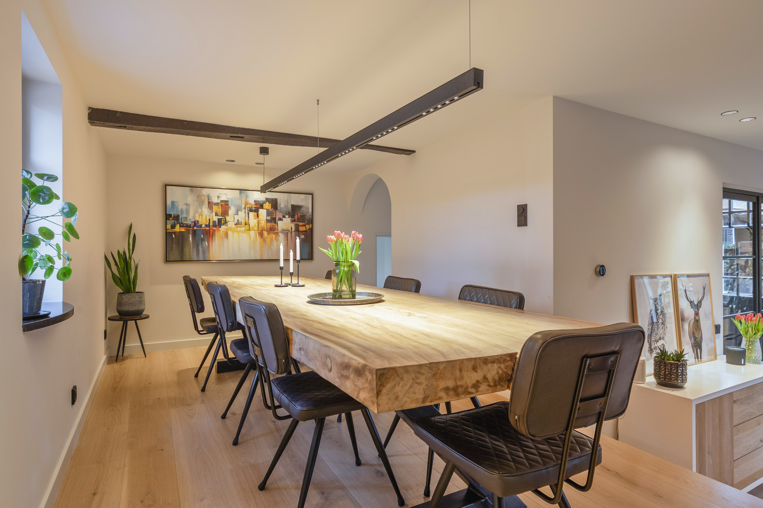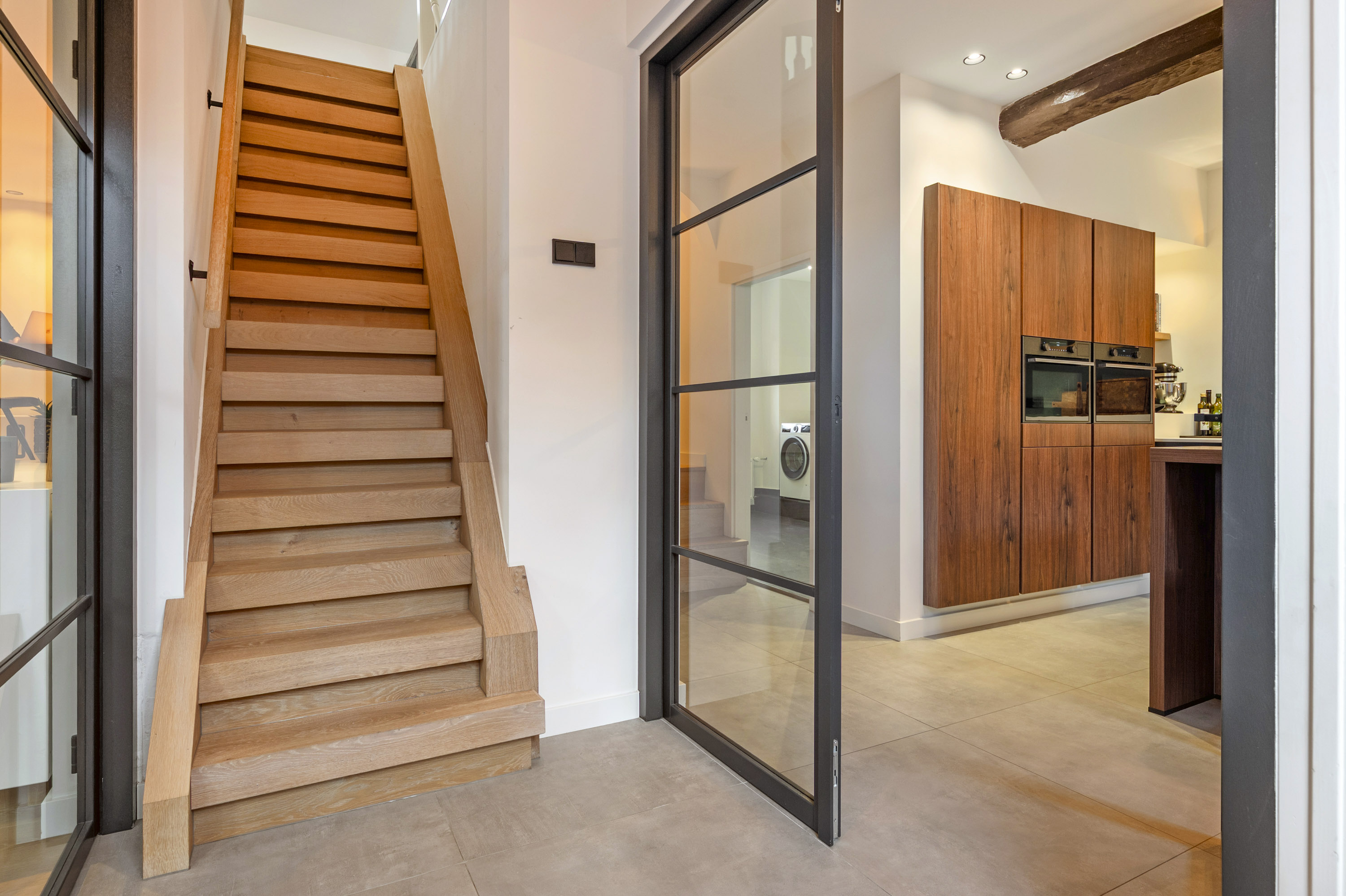 Mooie ruime ontvangsthal met gastentoilet, ruimte voor garderobe, werkkamer (ideaal voor thuiswerkplek of hobbykamer) en toegang tot de living. De woning beschikt over een tweede entree met mooie trap naar de eerste etage, de meterkast en een doorkijk naar keuken en living middels glazen deuren. De keuken is geheel gemoderniseerd en naast de nodige kastruimte en een fraai eiland voorzien van de volgende inbouwapparatuur; inductie kookplaat met geïntegreerde afzuiging (BORA), Quooker kraan, vaatwasser, koelkast, stoomoven en combi oven-magnetron. Vanuit de keuken is er toegang tot een leuke gewelfde kelder, een ruime bijkeuken (met aansluitpunten voor wasapparatuur) en een eetkamer. De living is een ware eye-catcher door onder andere de speelse indeling, de fraaie eikenhouten parketvloer en een mooie doorkijkhaard. De ruimte is ingedeeld tot een zitkamer/tv hoek en een iets hoger gelegen eetkamer met grote tafel.