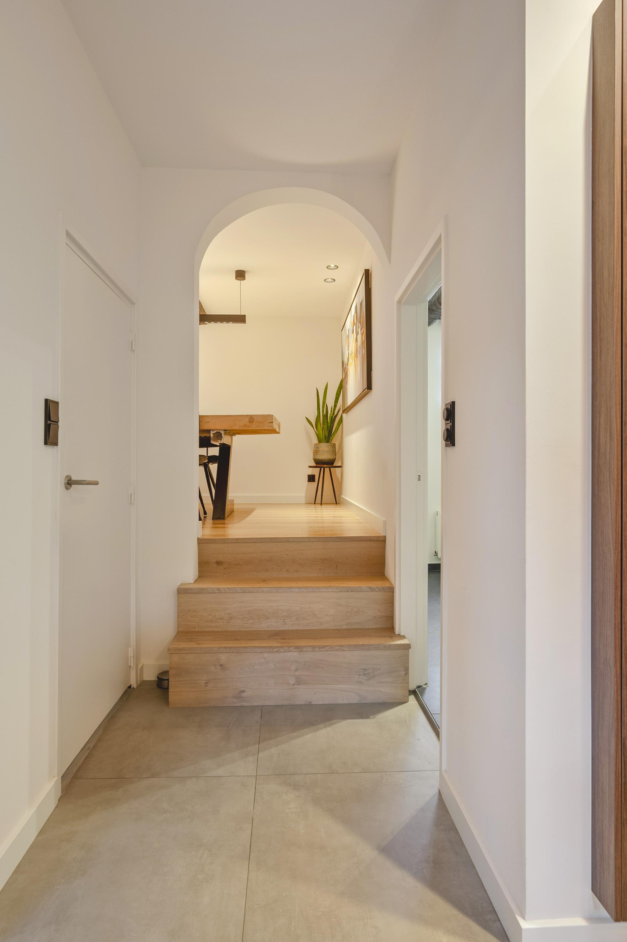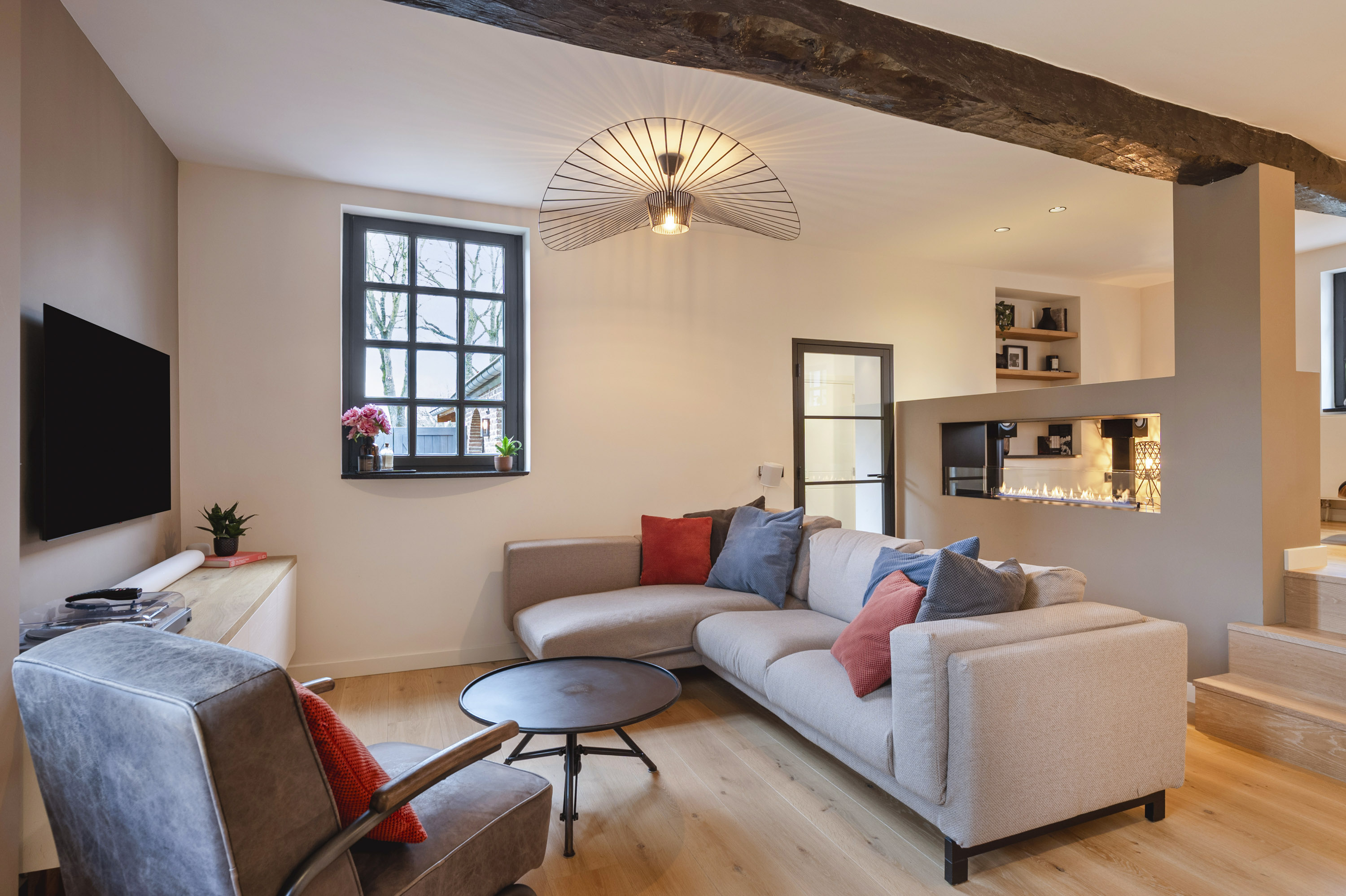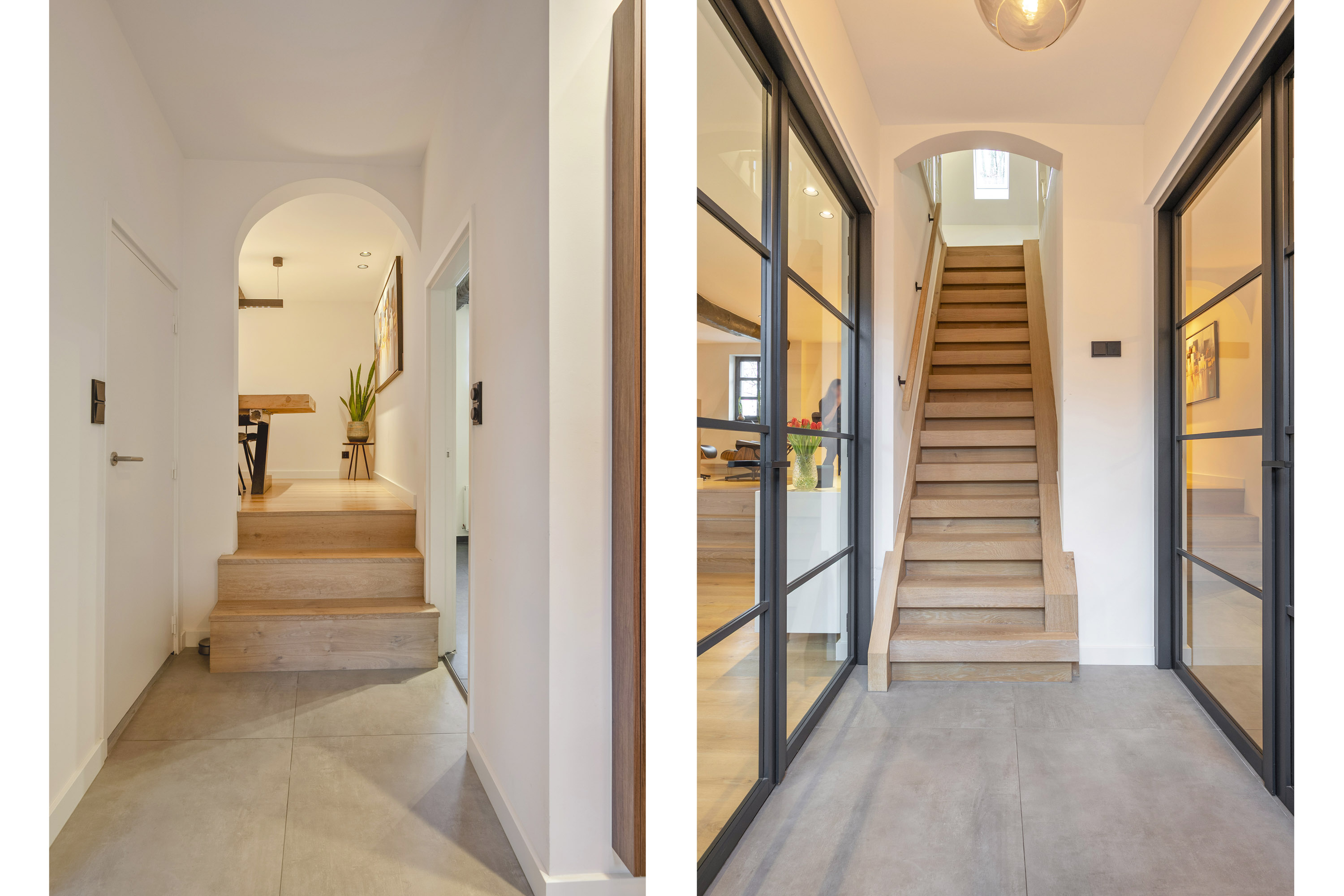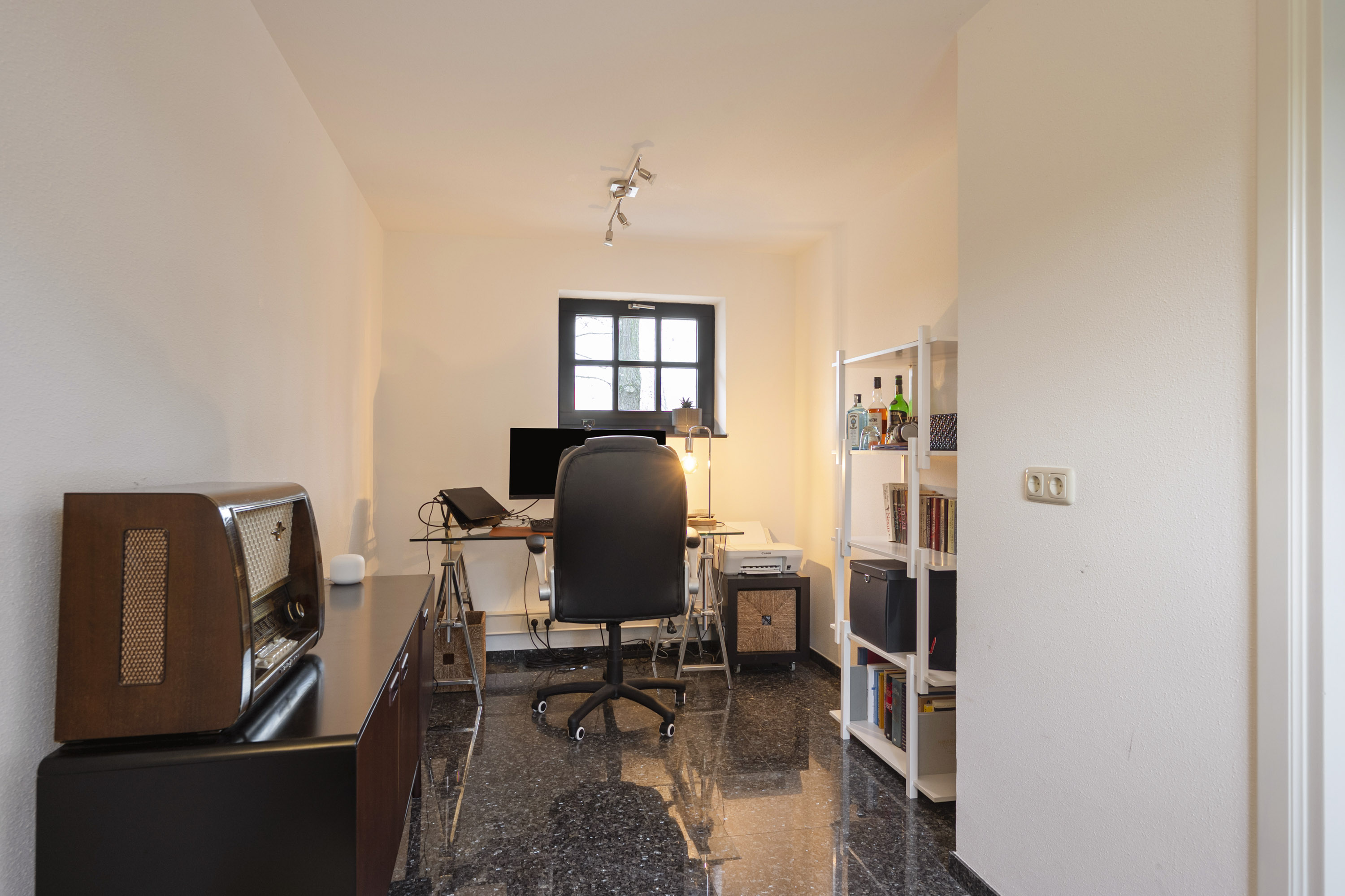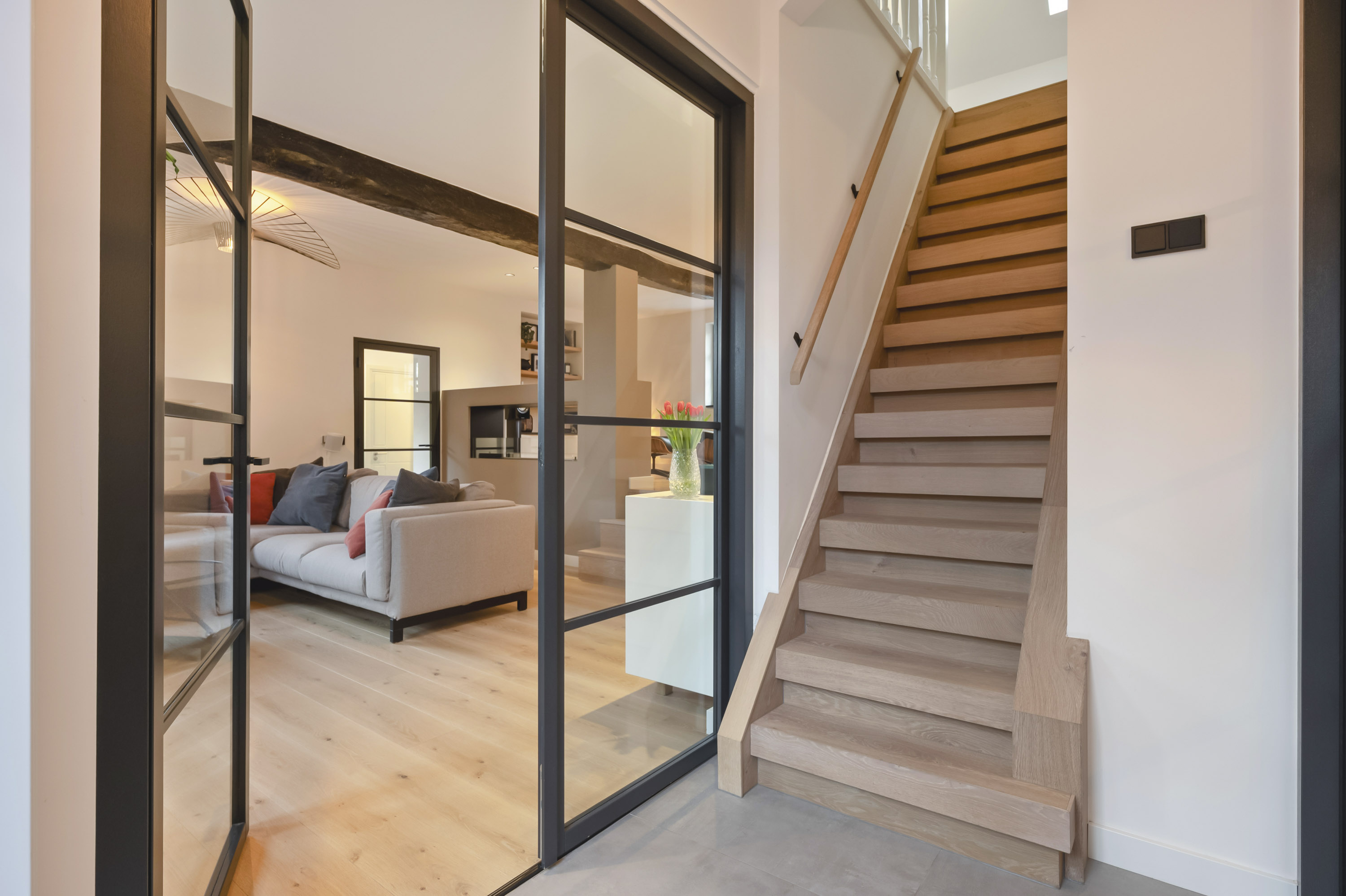Mooie ruime ontvangsthal met gastentoilet, ruimte voor garderobe, werkkamer (ideaal voor thuiswerkplek of hobbykamer) en toegang tot de living. De woning beschikt over een tweede entree met mooie trap naar de eerste etage, de meterkast en een doorkijk naar keuken en living middels glazen deuren. De keuken is geheel gemoderniseerd en naast de nodige kastruimte en een fraai eiland voorzien van de volgende inbouwapparatuur; inductie kookplaat met geïntegreerde afzuiging (BORA), Quooker kraan, vaatwasser, koelkast, stoomoven en combi oven-magnetron. Vanuit de keuken is er toegang tot een leuke gewelfde kelder, een ruime bijkeuken (met aansluitpunten voor wasapparatuur) en een eetkamer. De living is een ware eye-catcher door onder andere de speelse indeling, de fraaie eikenhouten parketvloer en een mooie doorkijkhaard. De ruimte is ingedeeld tot een zitkamer/tv hoek en een iets hoger gelegen eetkamer met grote tafel.