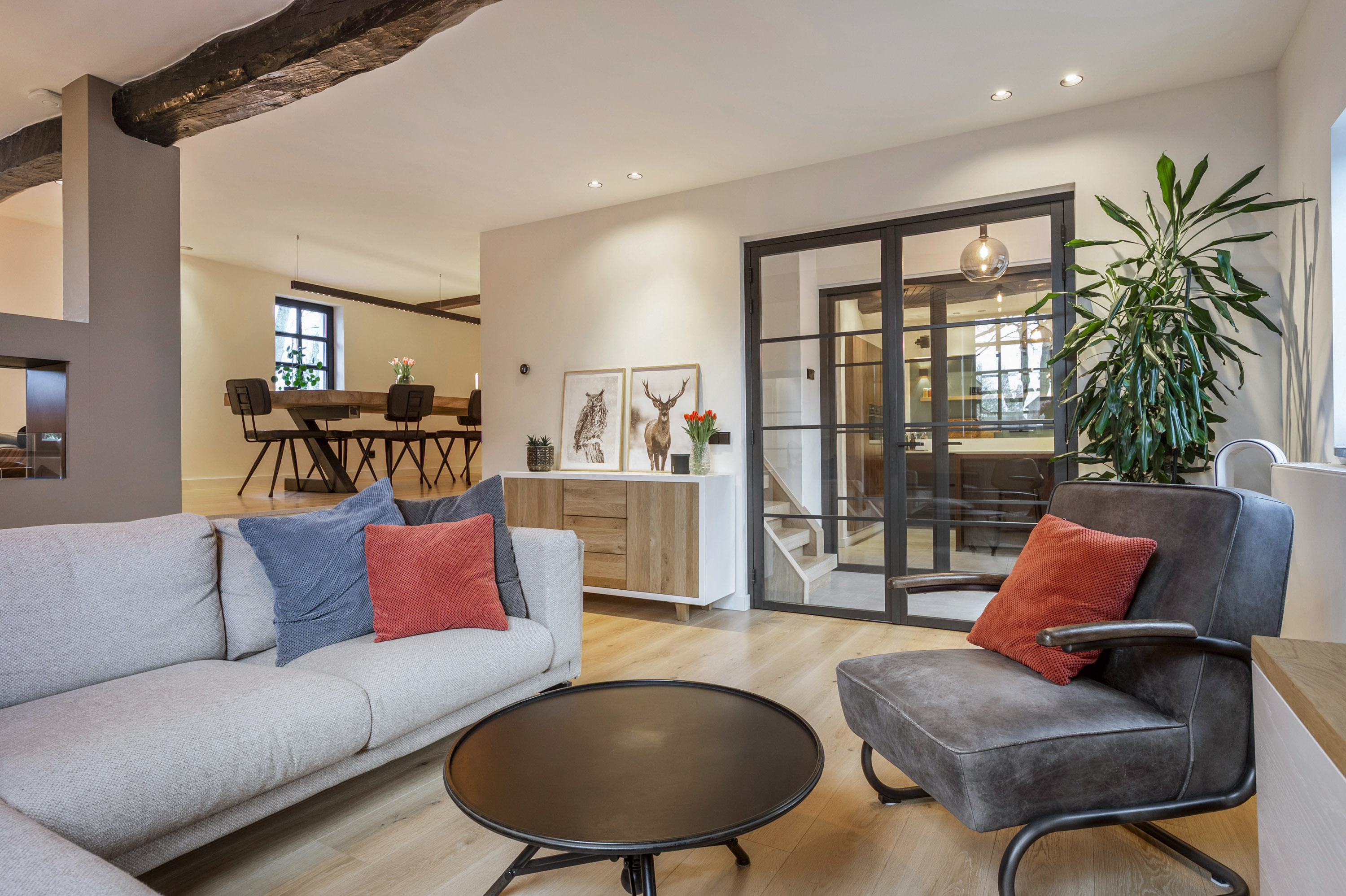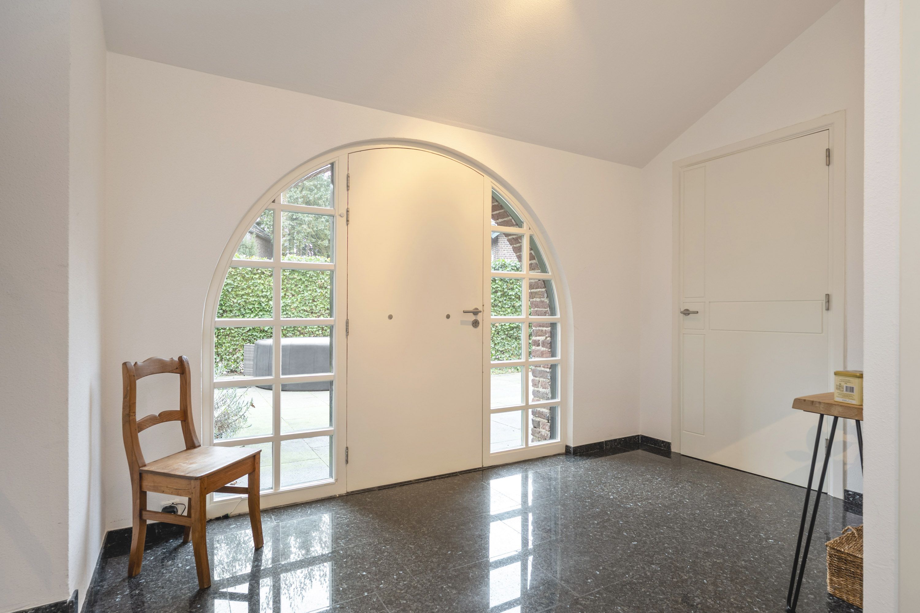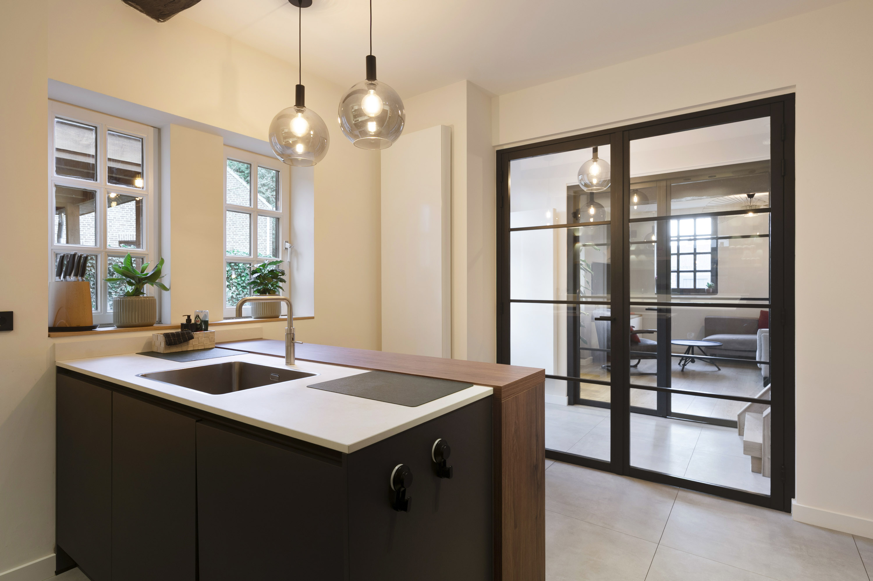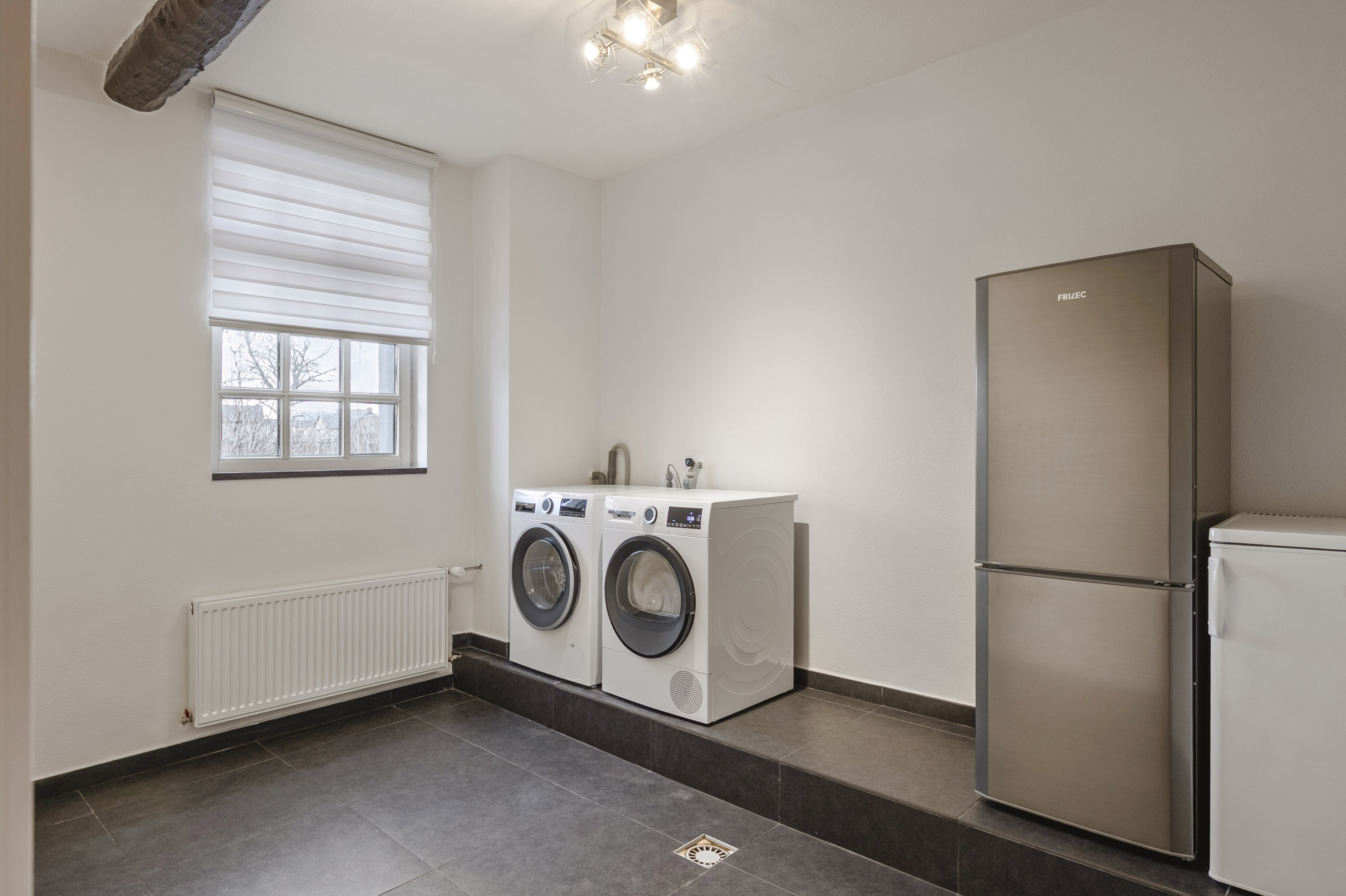 Mooie ruime ontvangsthal met gastentoilet, ruimte voor garderobe, werkkamer (ideaal voor thuiswerkplek of hobbykamer) en toegang tot de living. De woning beschikt over een tweede entree met mooie trap naar de eerste etage, de meterkast en een doorkijk naar keuken en living middels glazen deuren. De keuken is geheel gemoderniseerd en naast de nodige kastruimte en een fraai eiland voorzien van de volgende inbouwapparatuur; inductie kookplaat met geïntegreerde afzuiging (BORA), Quooker kraan, vaatwasser, koelkast, stoomoven en combi oven-magnetron. Vanuit de keuken is er toegang tot een leuke gewelfde kelder, een ruime bijkeuken (met aansluitpunten voor wasapparatuur) en een eetkamer. De living is een ware eye-catcher door onder andere de speelse indeling, de fraaie eikenhouten parketvloer en een mooie doorkijkhaard. De ruimte is ingedeeld tot een zitkamer/tv hoek en een iets hoger gelegen eetkamer met grote tafel.