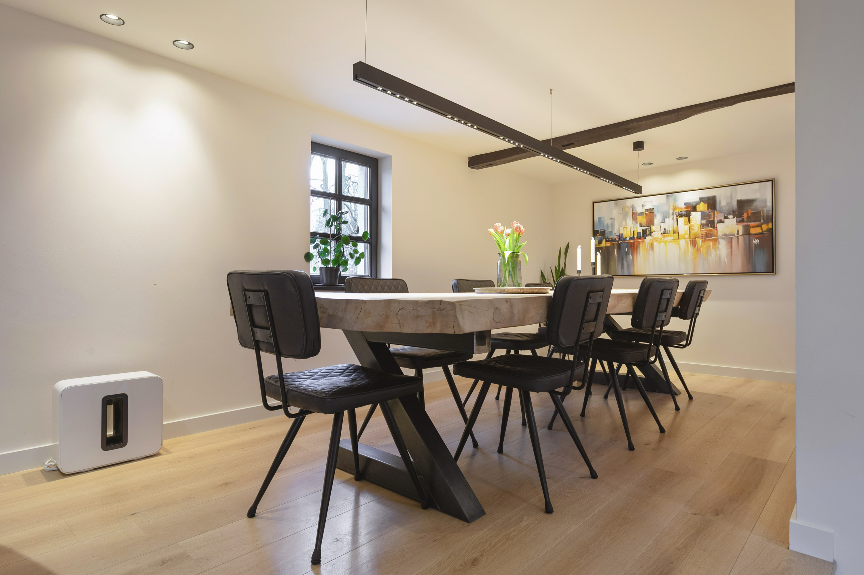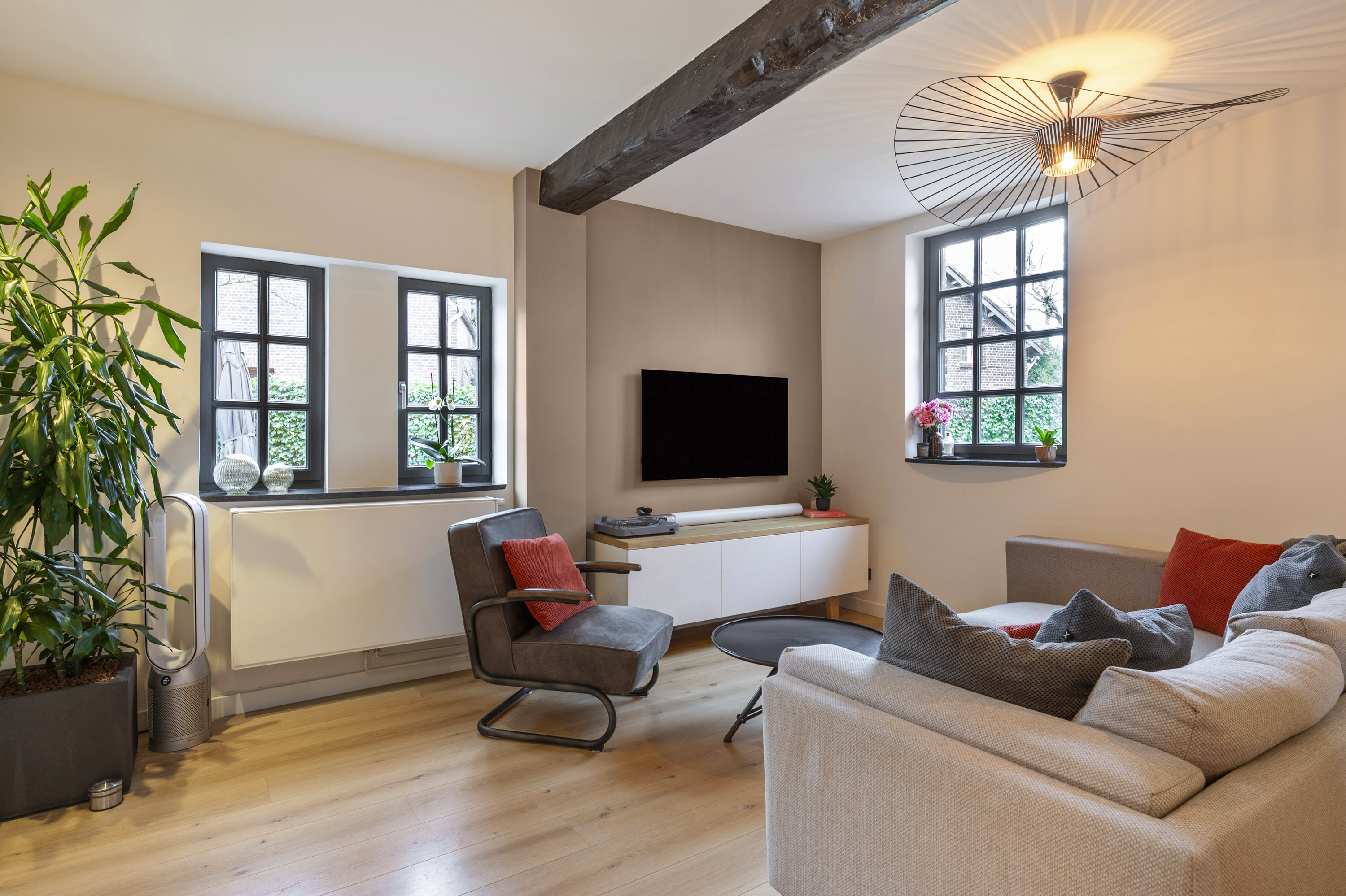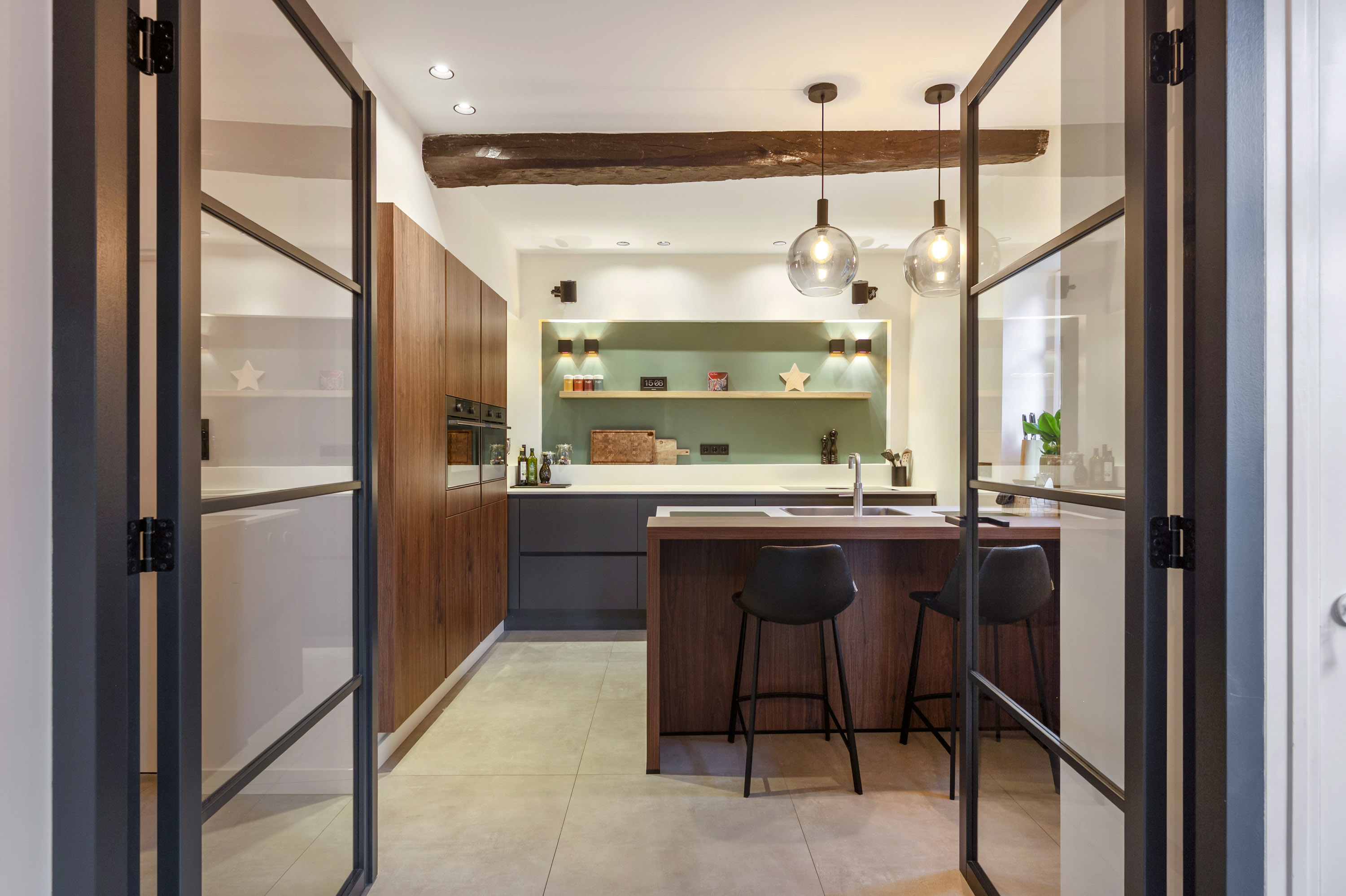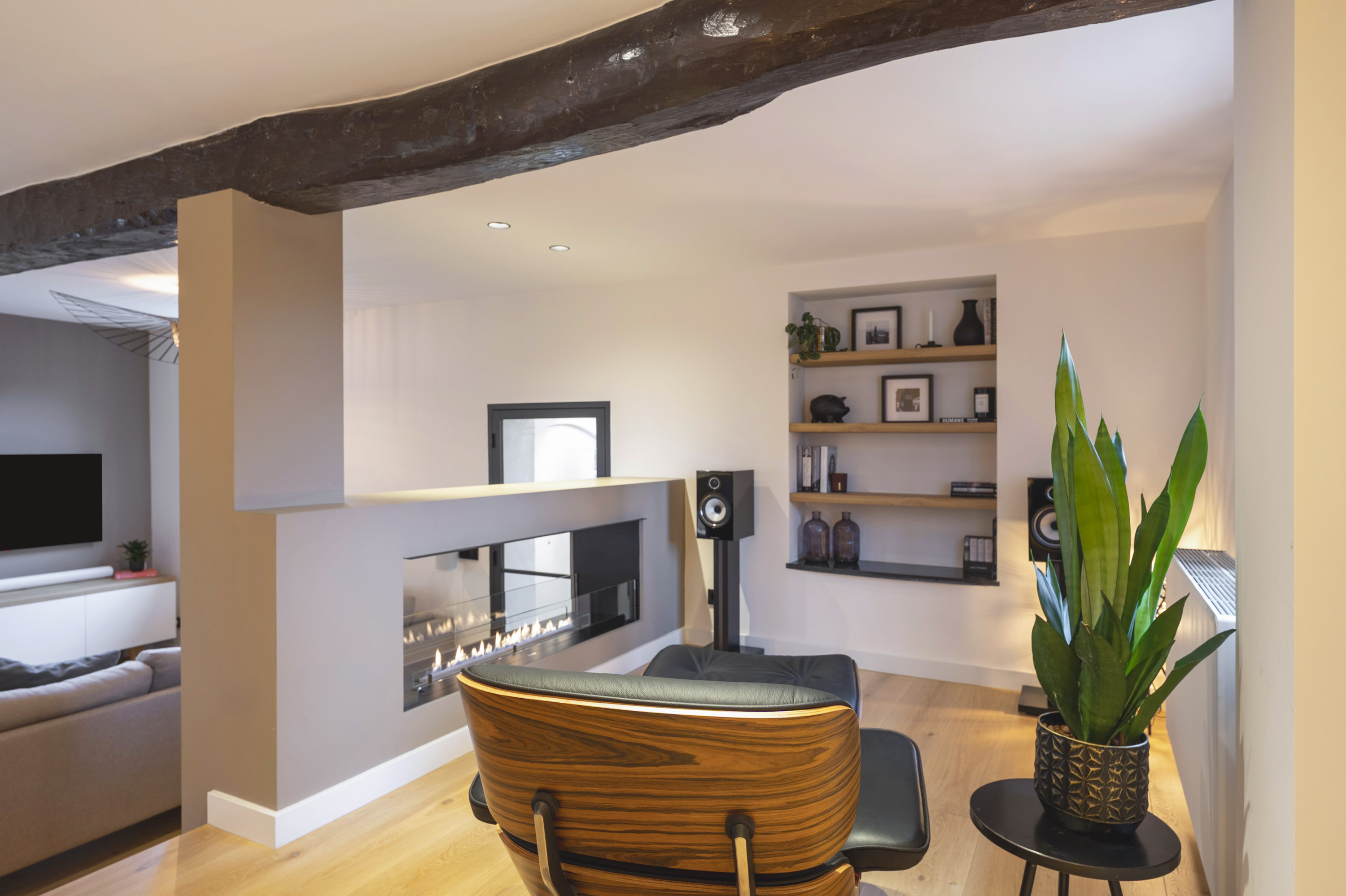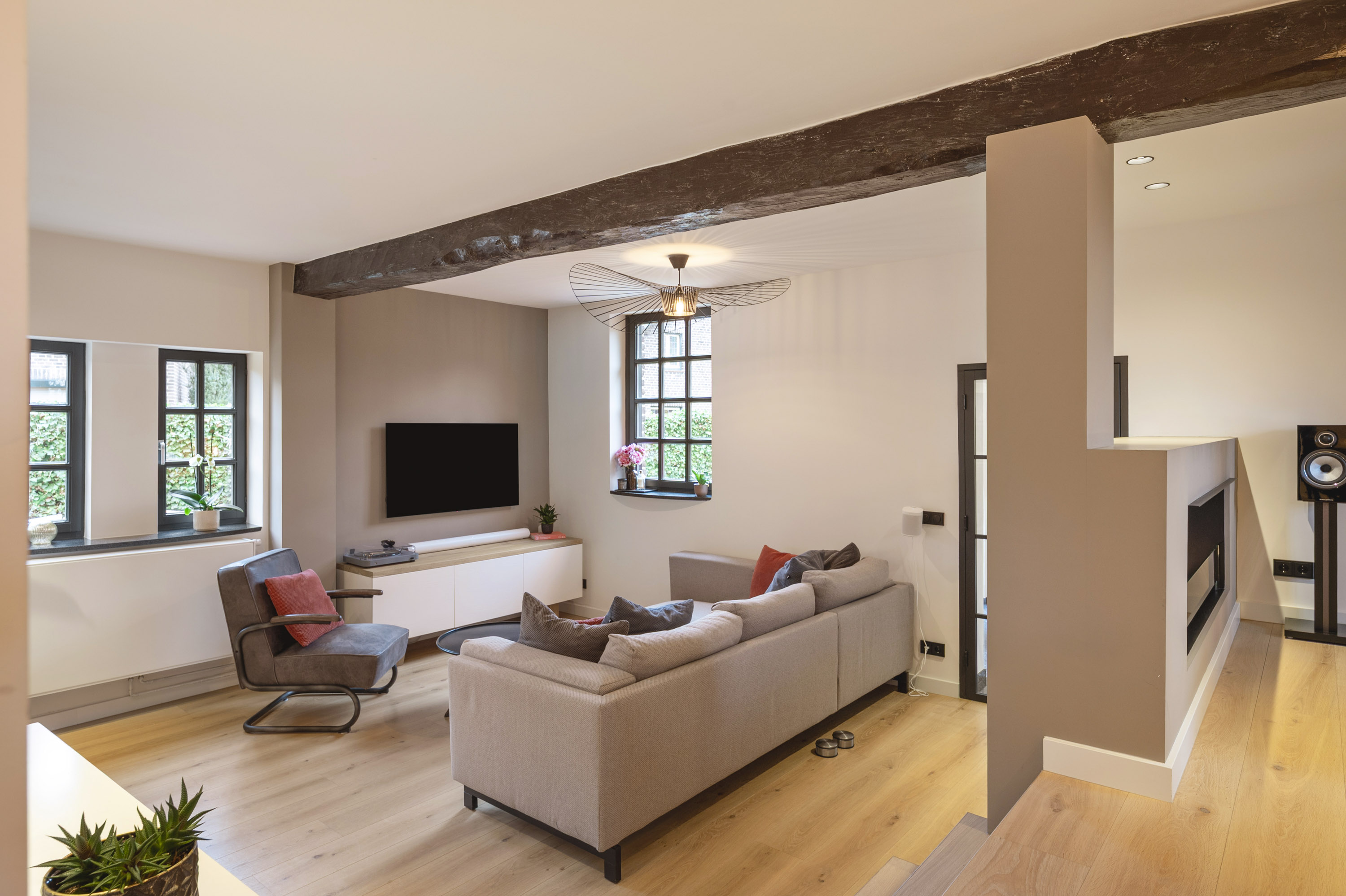 Mooie ruime ontvangsthal met gastentoilet, ruimte voor garderobe, werkkamer (ideaal voor thuiswerkplek of hobbykamer) en toegang tot de living. De woning beschikt over een tweede entree met mooie trap naar de eerste etage, de meterkast en een doorkijk naar keuken en living middels glazen deuren. De keuken is geheel gemoderniseerd en naast de nodige kastruimte en een fraai eiland voorzien van de volgende inbouwapparatuur; inductie kookplaat met geïntegreerde afzuiging (BORA), Quooker kraan, vaatwasser, koelkast, stoomoven en combi oven-magnetron. Vanuit de keuken is er toegang tot een leuke gewelfde kelder, een ruime bijkeuken (met aansluitpunten voor wasapparatuur) en een eetkamer. De living is een ware eye-catcher door onder andere de speelse indeling, de fraaie eikenhouten parketvloer en een mooie doorkijkhaard. De ruimte is ingedeeld tot een zitkamer/tv hoek en een iets hoger gelegen eetkamer met grote tafel.