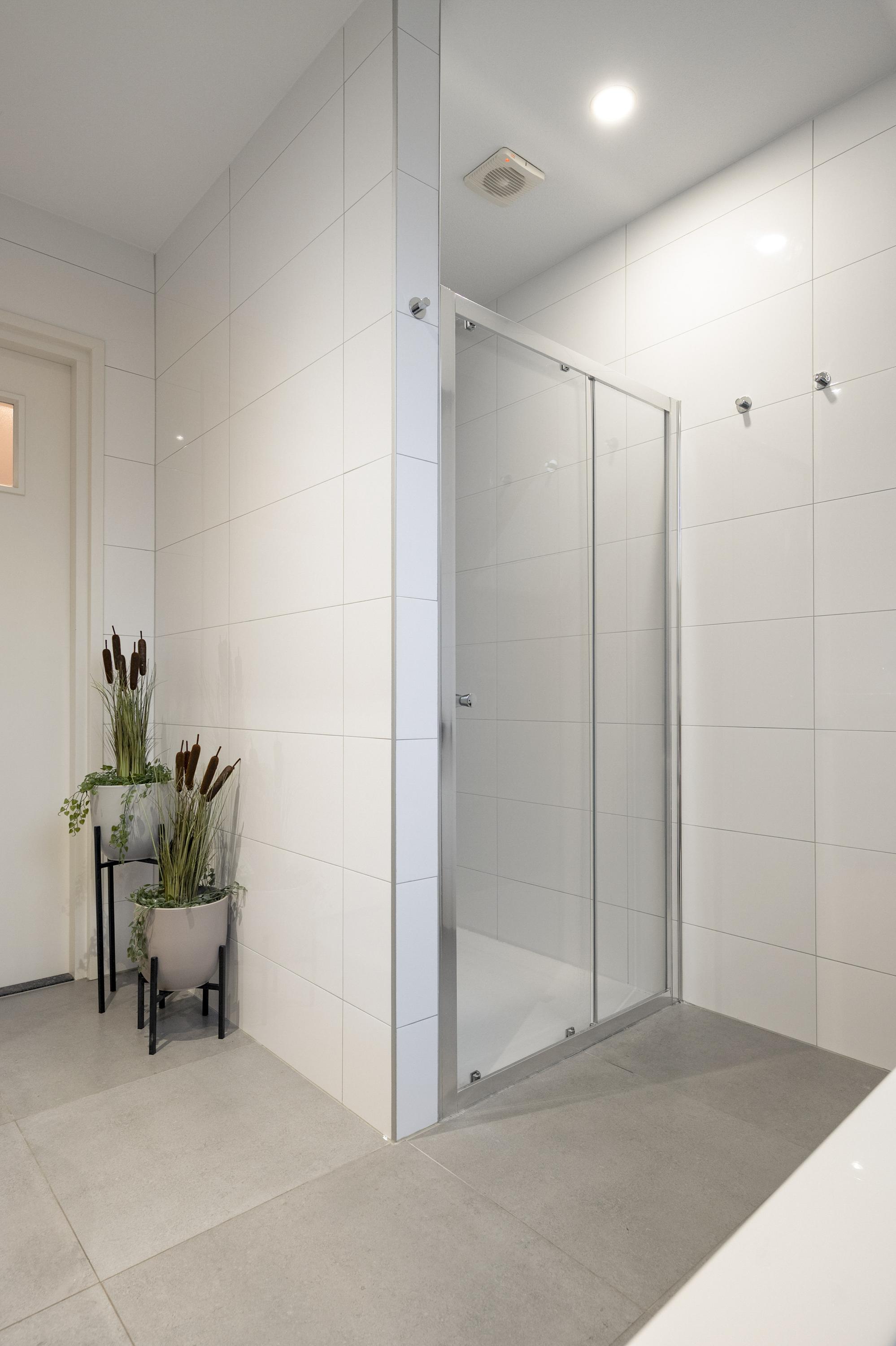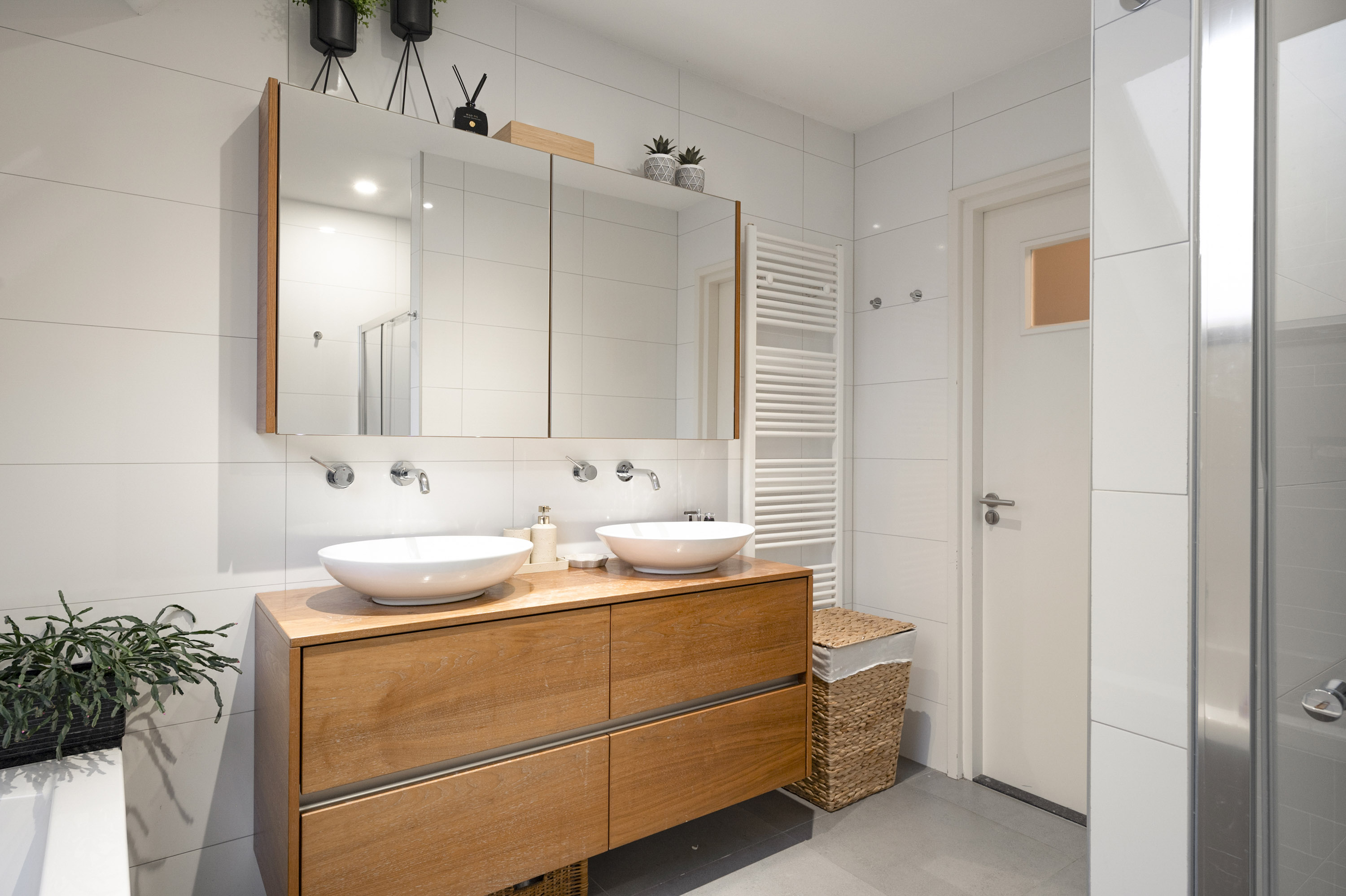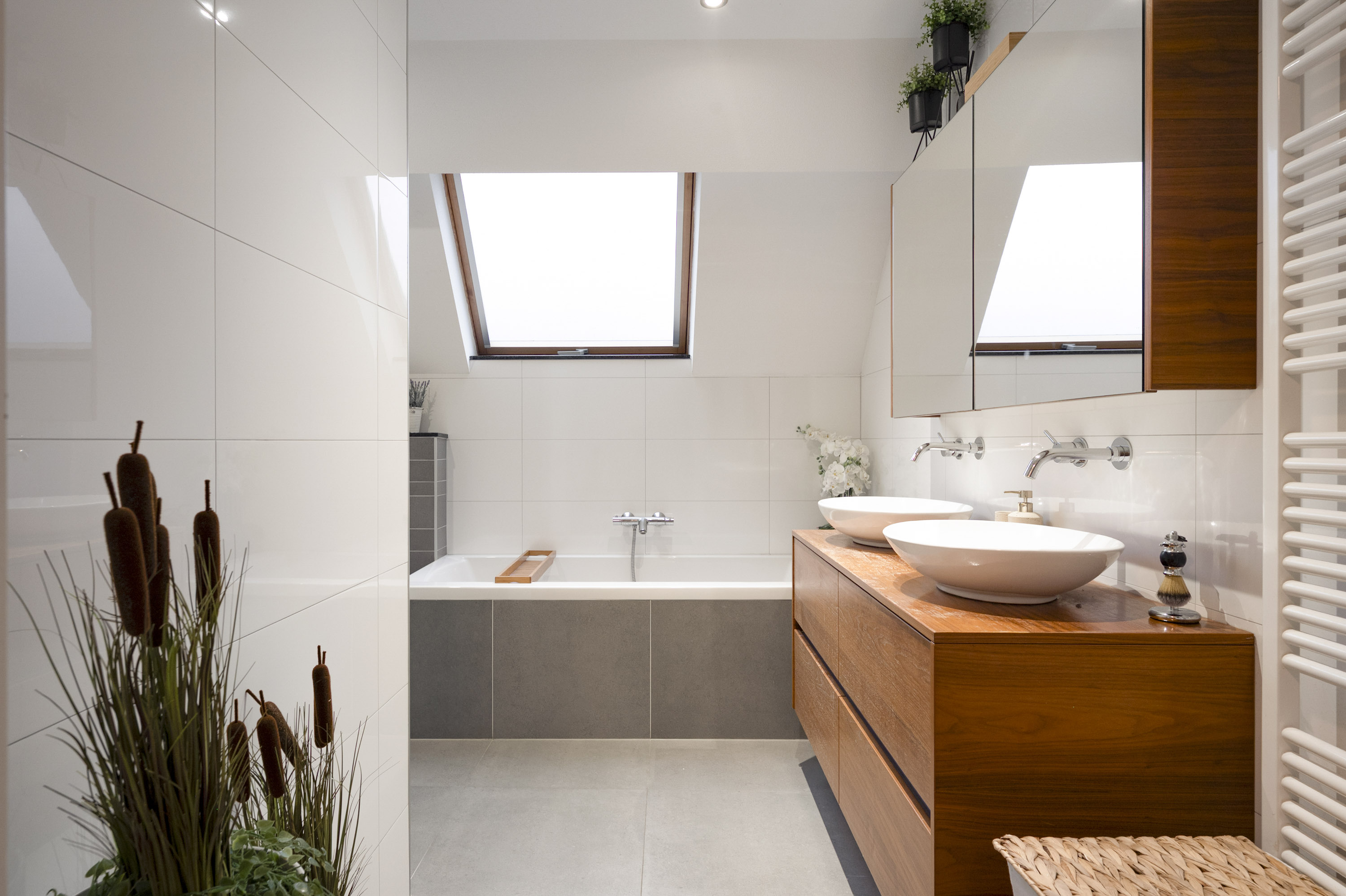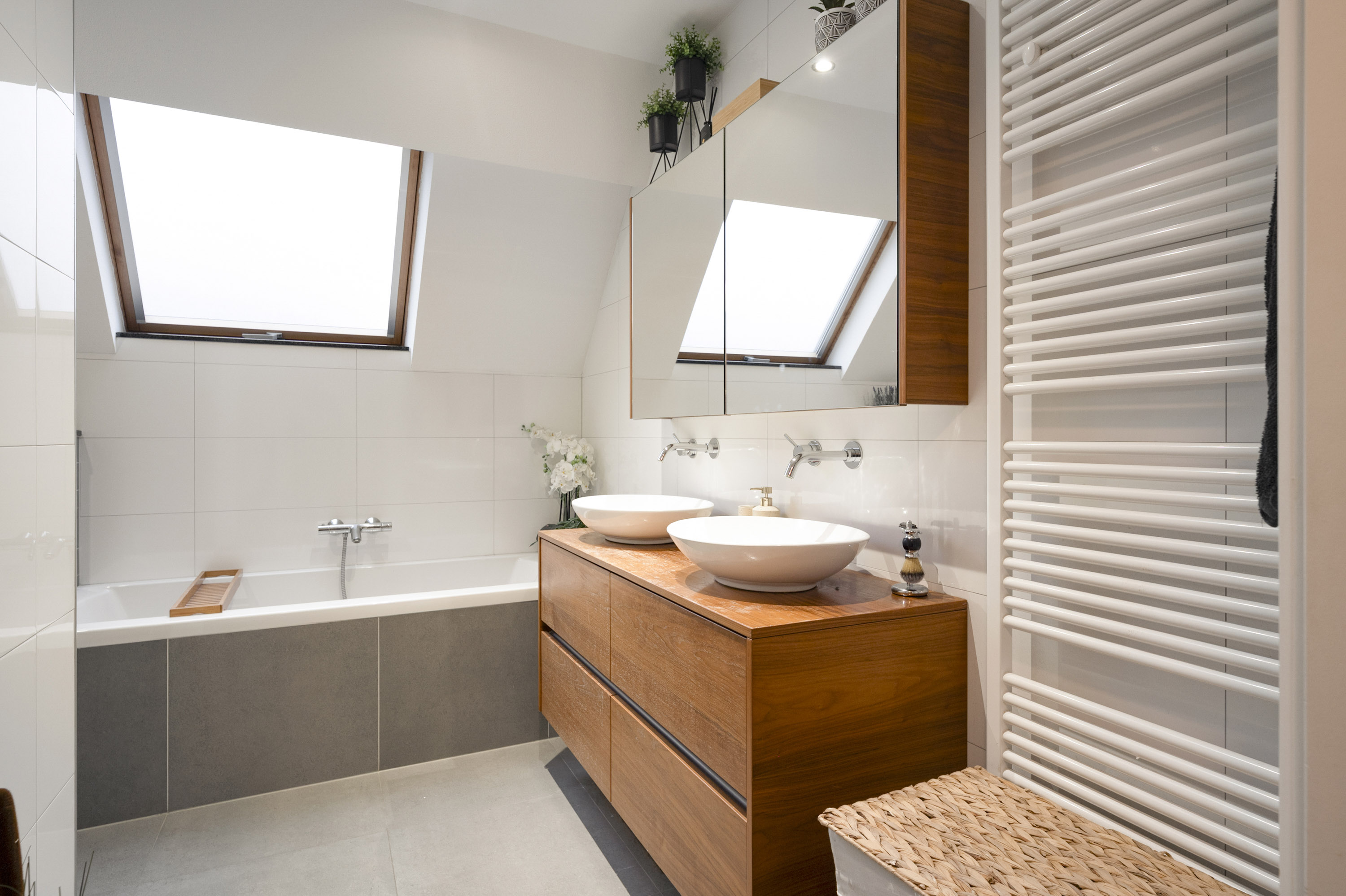 - fraaie modern uitgevoerde badkamer met ligbad, inloopdouche, toilet, dubbele wastafel en dakraam