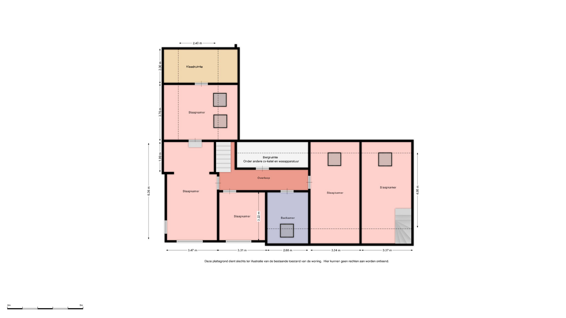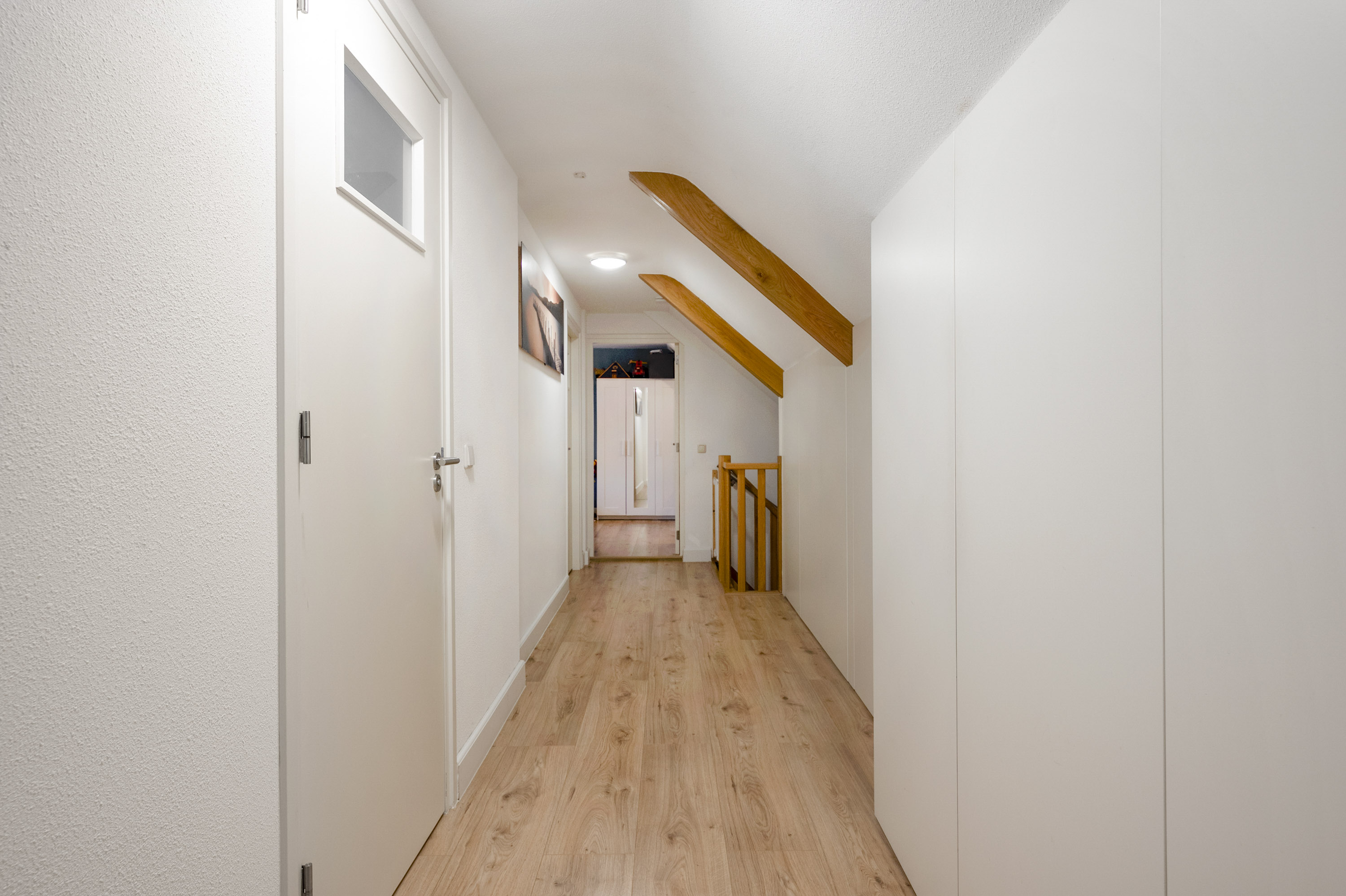 Overloop/gang met veel kastruimte in de schuine delen van het dak (voorzien van onder andere cv-ketel en aansluitpunten voor wasapparatuur) en achtereenvolgens toegang tot;