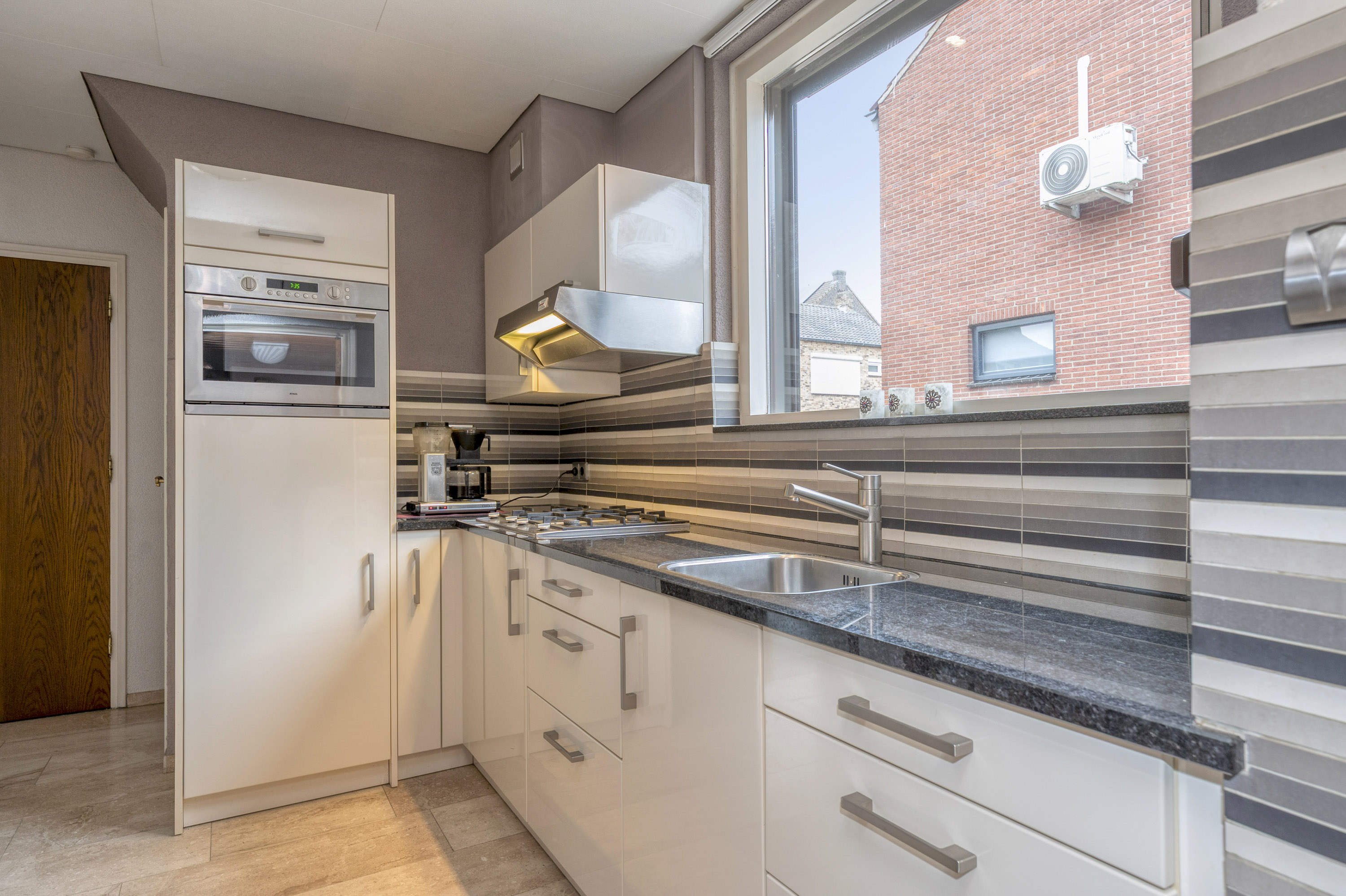 Hal/entree met meterkast, trap richting de eerste etage en toegang tot de keuken. De keuken is gesloten van aard en biedt een eigentijdse aanbouwkeuken met kastruimte en de volgende apparatuur; koelkast, combi oven-magnetron en een gaskookplaat met afzuigkap. De open doorloop richting de woonkamer biedt een ruimtelijk geheel hetgeen wordt versterkt door de mooie doorlopende vloer. Aansluitend aan de keuken is de bijkeuken gelegen met deur naar de oprit en de tuin. Tevens is hier het toilet gesitueerd. Via een gang bereikt men een slaapkamer (met kastenwand) die beschikt over een eigen badkamer (voorzien van douche, wastafel en toilet). Deze ruimte maakt de woning voor veel doelgroepen geschikt, denk aan levensloopbestendig wonen, zorg, een aangename thuiswerkplek of extra (speel)kamer voor kinderen.