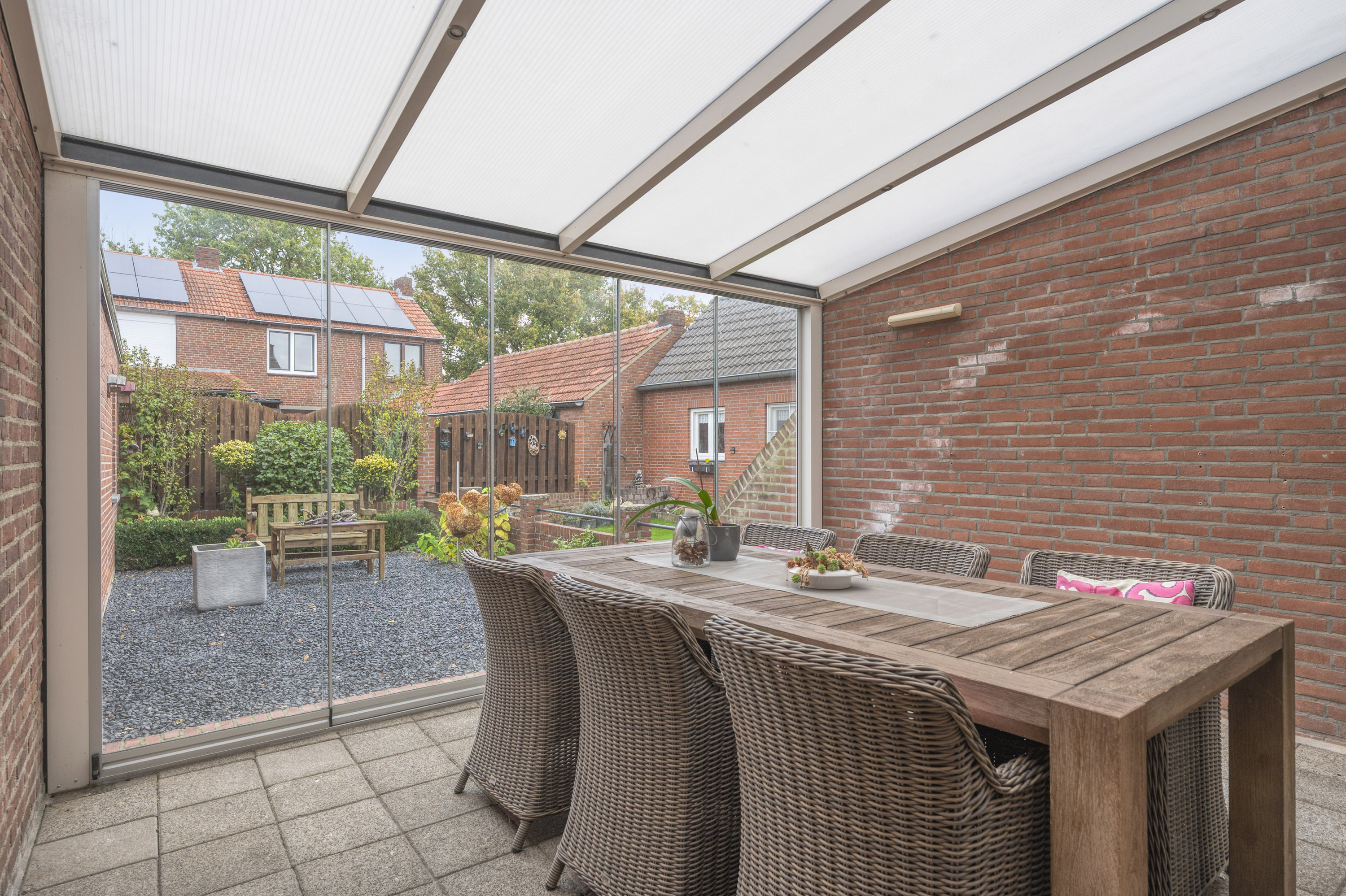 De woning beschikt aan straatzijde over een onderhoudsarme voortuin en een ruime eigen oprit. De achtertuin kenmerkt zich door de ruime terrasoverkapping welke met een glazen schuifwand afgesloten kan worden.